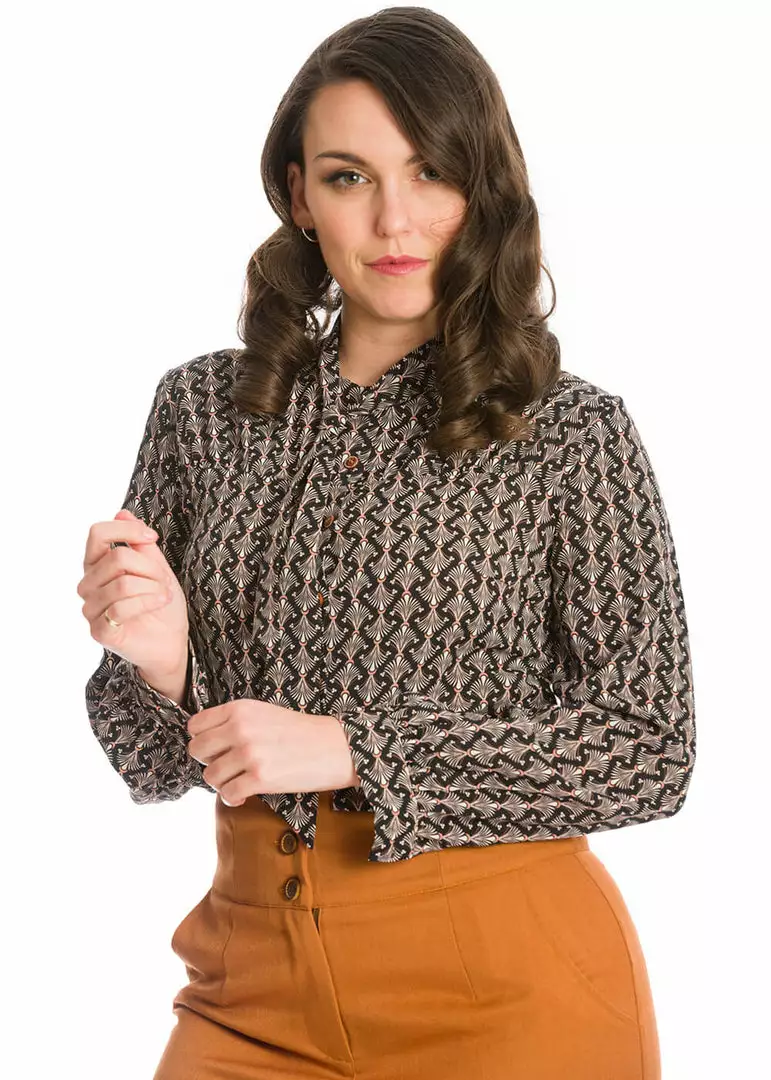 The collar transforms into a bow, so chique! She is long enough to be worn with trousers, but also pretty with a high waist skirt or trousers.