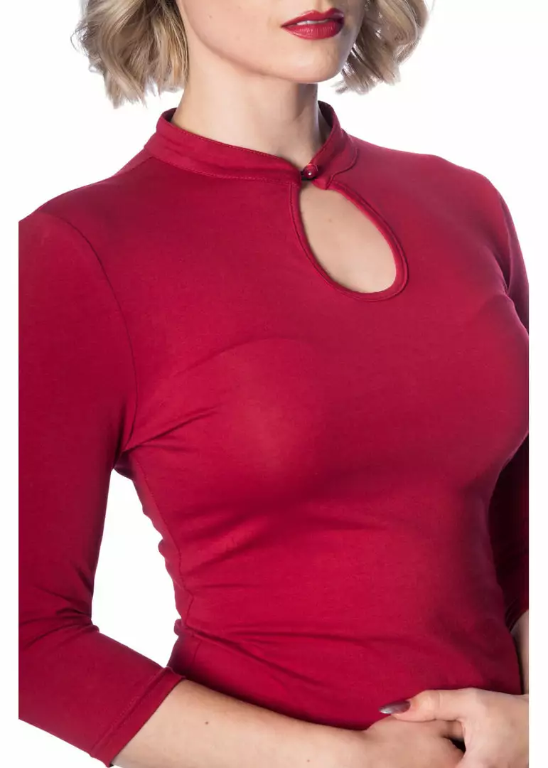 This stunning top is one you’ll want to wear with everything, she has a playful keyhole and a sweet button. Her collar can elegantly stand up straight for a classy chic fit. She is long enough to be worn with normal trousers, but ofcourse she looks super cute with some high waist trousers or a high waist skirt!