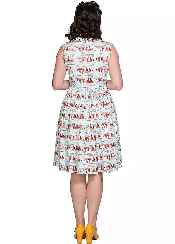 Cover yourself in boats and waves this summer! The collar and buttons on the front give her a playful 40s look and she’s made of a lovely cotton-mix with a slight stretch. From the waist down she continues through little pleats into a playful skirt which with a height of 1,70 reaches down above the knee. To make those boats sail away you can combine her with one of our petticoats and she closes with a zipper on the side.