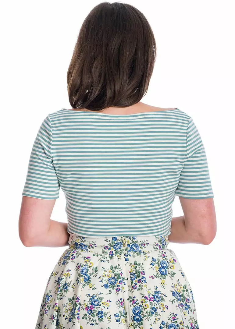 This cheerful looking top is made out of 100% cotton with a lovely stretch, making you want to wear her underneath or on top of every skirt or pair of trousers you have. 40s nautical, 60s Bardot and everything inbetween, this cutie is indispensable for your wardrobe!