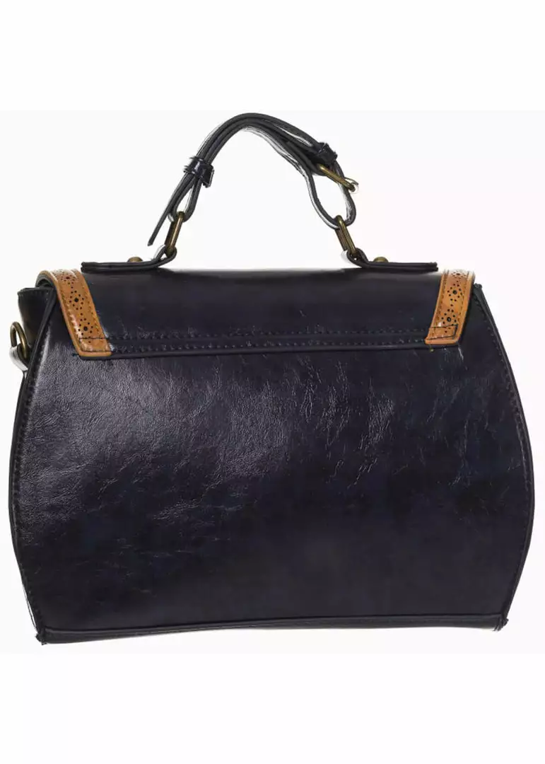 Banned surprised us with this gorgeous Stevie Purse! Made from a beautiful quality faux-leather she nicely keeps her shape without getting saggy. The most fun part to us it the closure, that you can slide right through… Underneath is an open front pocket, ideal for your phone. The green and brown look very classy. On the inside, which closes with a zipper, is a zipper pocket and two open pockets. She can be easily held by the handle, but for extra convenience she comes with a detachable shoulderstrap made of the same faux-leather.