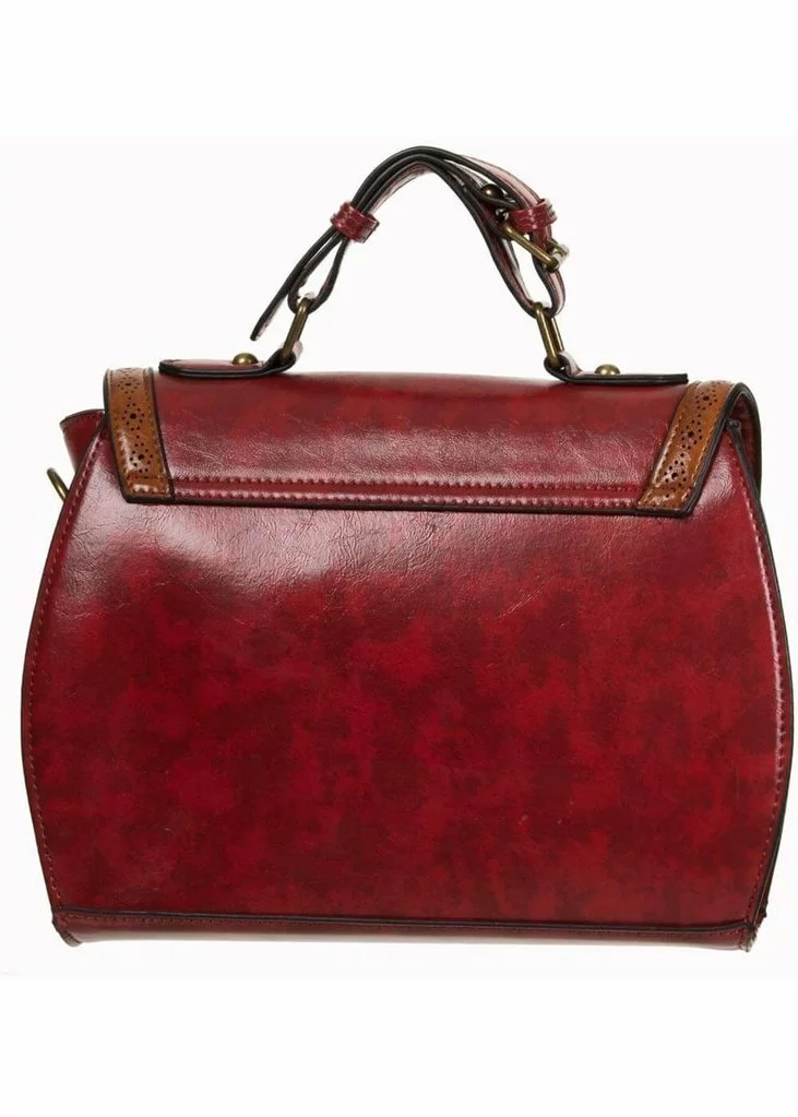 Made from a beautiful quality faux leather she stays nicely firm without loosing her shape. The best part to us is the closure, which you just slide right in… Underneath is an open front pocket, perfect for your phone. The dark red and brown looks so classy. On the inside, which closes with a zipper, it has a zipper pocket and two open pockets. Conveniently hold her by the handle, but for added convenience she comes with a shoulderstrap in the same dark red faux-leather.