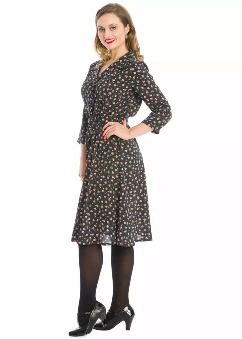 The bodice is adorned with a collar and smooth buttons until the waist. The flat pleats at the shoulders as well as above and underneath the waist make for a perfect 40’s look. The waist is accentuated by the removable belt, from where she flares into an elegant A-line skirt with pockets. She closes with a zipper in the back and falls on the knees for a height of 1,70 m.