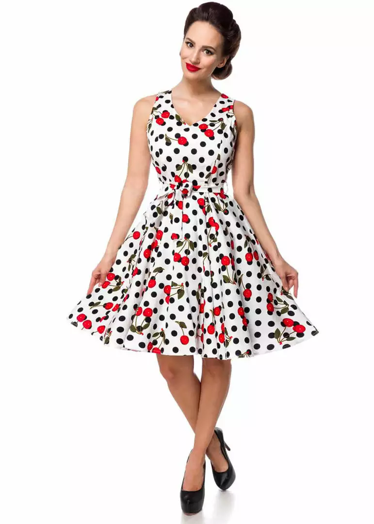 Your eyes won’t know where to look first: the seductive v-neck, the shiny cherries on the background of breathable cotton with polkadots or the cute bow in the waist? The princess seams, together with the slight stretch, make for a stunning fit and a VaVaVoom silhouette.