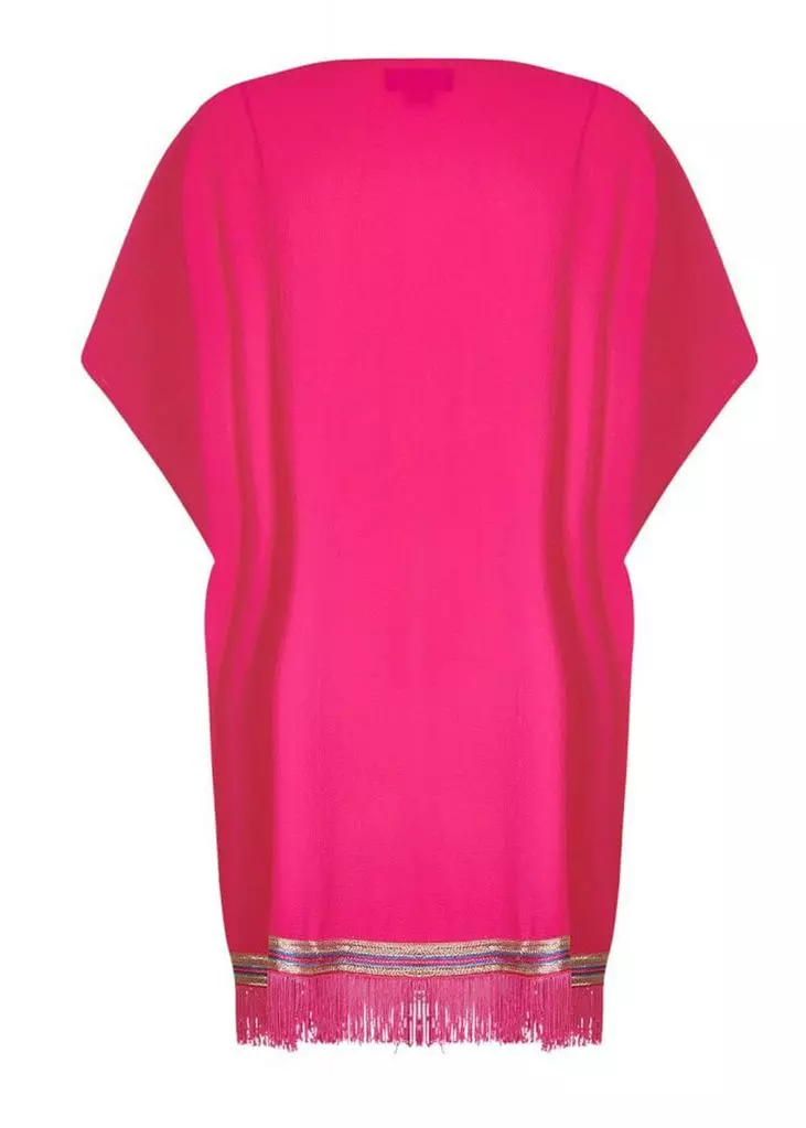 Deze schitterende kimono is prachtig stofje dat voelt als crêpe in een niet-te-missen roze! De rand is spectaculair met haar goud en blauw trim. Alleen al over een topje met palazzo broek (of badbak dus!) heb je een outfit om van te kwijlen, en ook boven veel jurken is ze absolutly stunning… De onderkant van dit losse model is opgeleukt met fringe voor een feestelijk 70’s (of 20’s) effect.