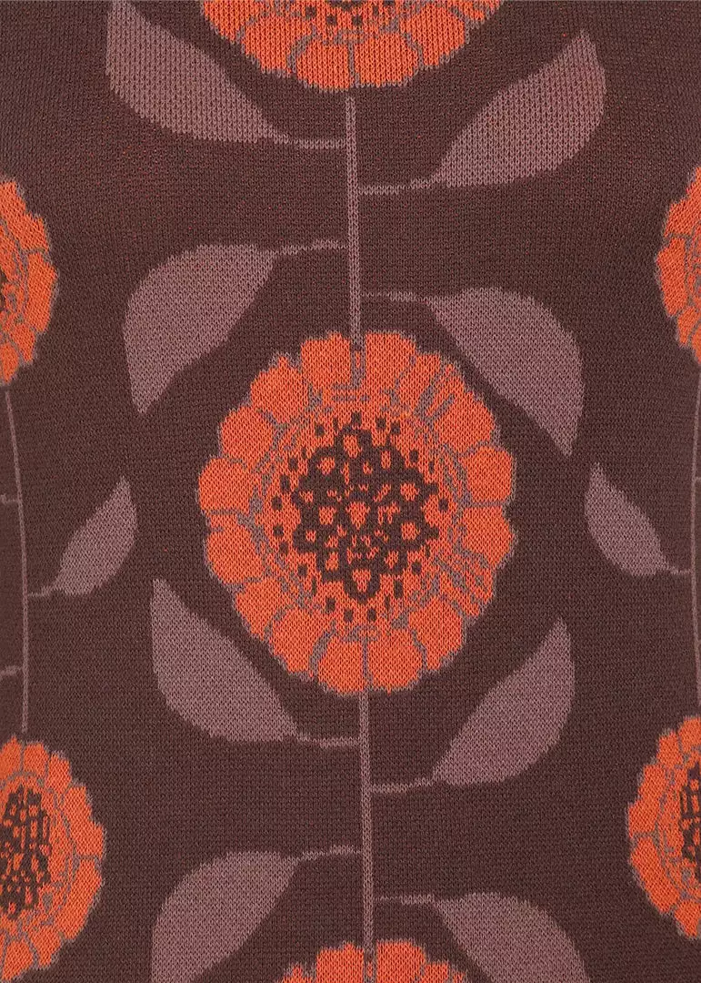 This cutie is nicely warm and adorably floral, and the combination of the big orange flowers with the brown background make for a fun 60’s or 70’s look.