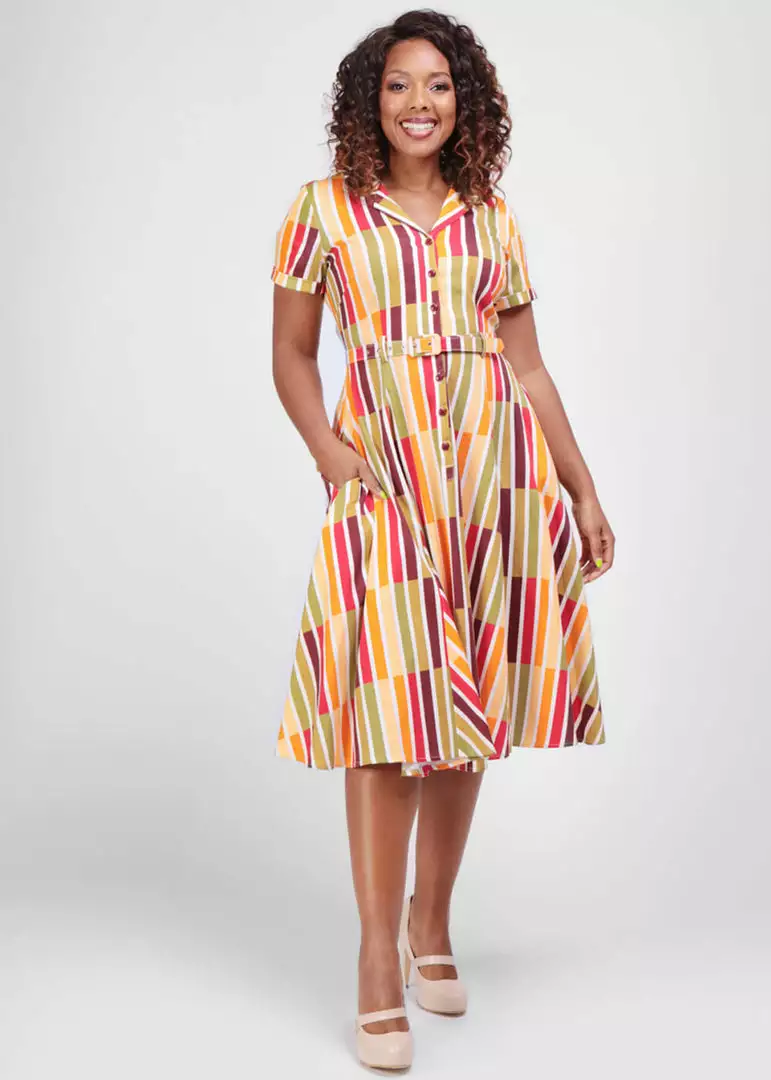 This beauty is lovely lightweight thanks to her fine cotton-mix with slight stretch, covered with those palyful stripes. She closes with the buttons in the front for a timeless shirt-look. The waist is accentuated by the removable belt, from where she flares into a full skirt with pockets, that you can beautifully wear with one of our petticoats for the perfect vintage-picture.