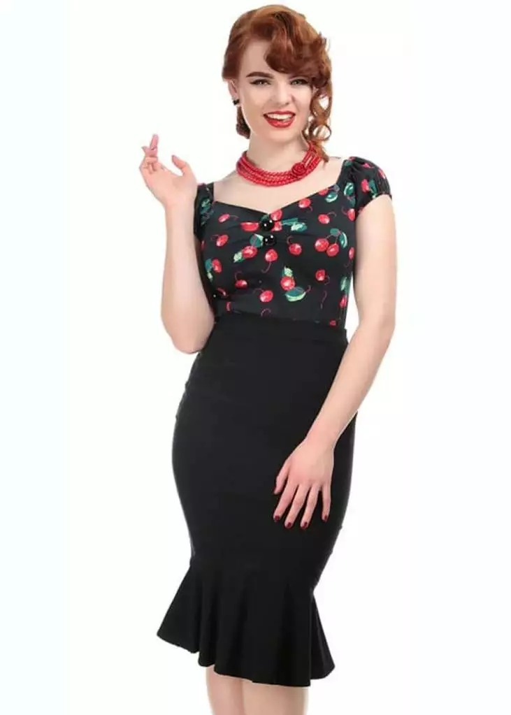 This model has a sexy pinup appearance because of her sweetheart neckline and the typical carmen style sleeves, that slightly puff up thanks to the elastic. Because of the slight stretch the top is nice and form fitting for an amazing VaVaVoom feeling, there’s a zipper on the side.