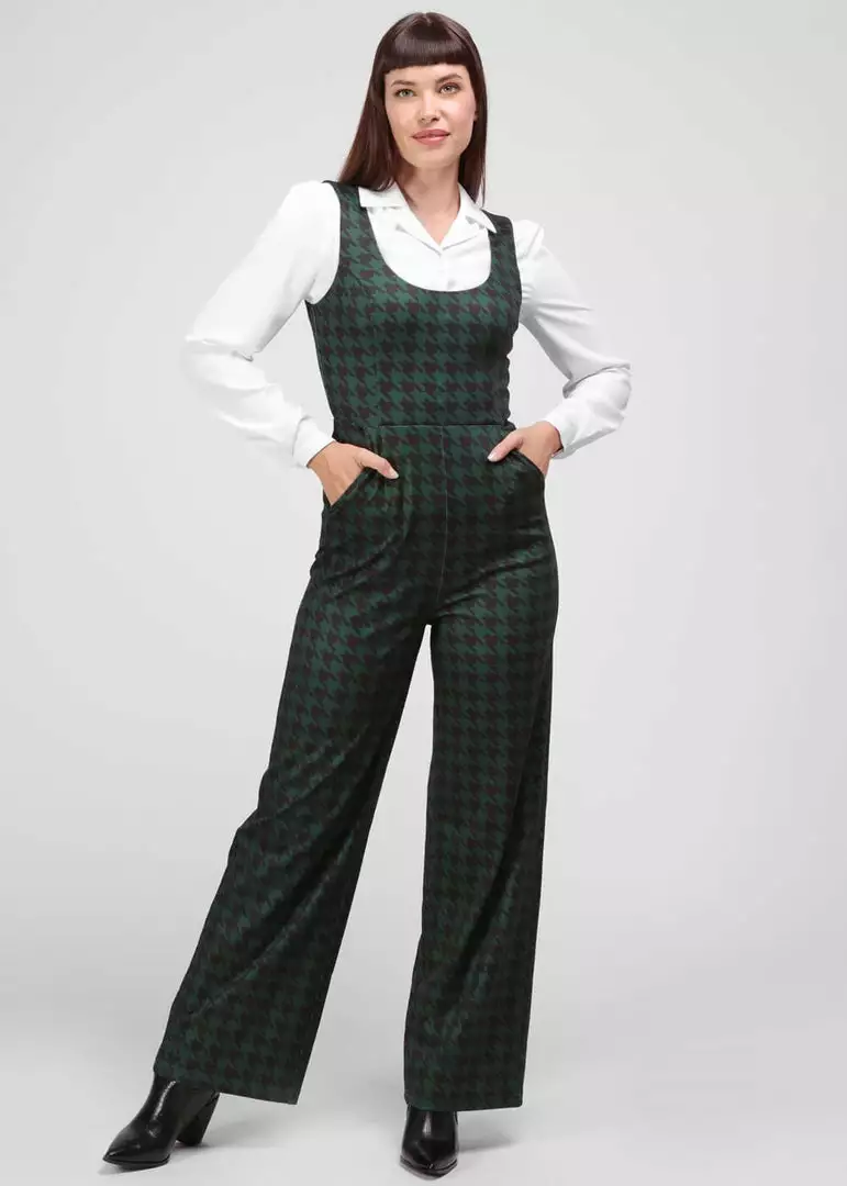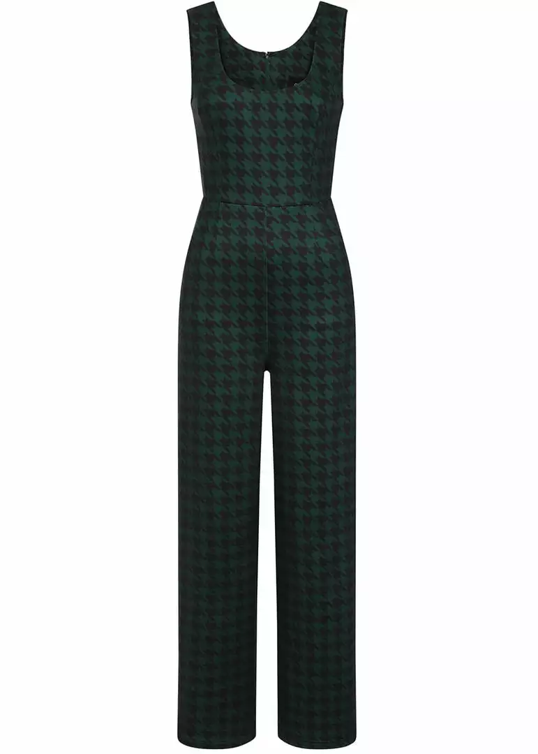 A stunning jumpsuit, with her round neckline and stylsih houndstooth pattern. Made of a strong but smooth fabric with stretch and figure seams, she is lovely closefitting until the waist. From the waist seam, she transforms into long wide trouserlegs with pockets, and she closes with a zipper on the back.