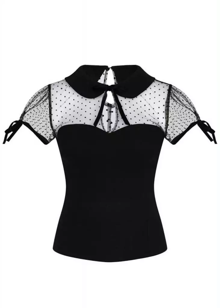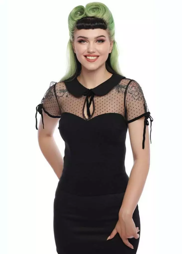 This beauty is both sexy and innocent at the same time, with her sweetheart neckline and Peter Pan collar, and inbetween that boudoir worthy mesh with velvet polkadots! The puffy sleeves and the peekaboo down the neckline are both decorated with a velvet ribbon aswel. The keyhole on the back can be created by closing the button.