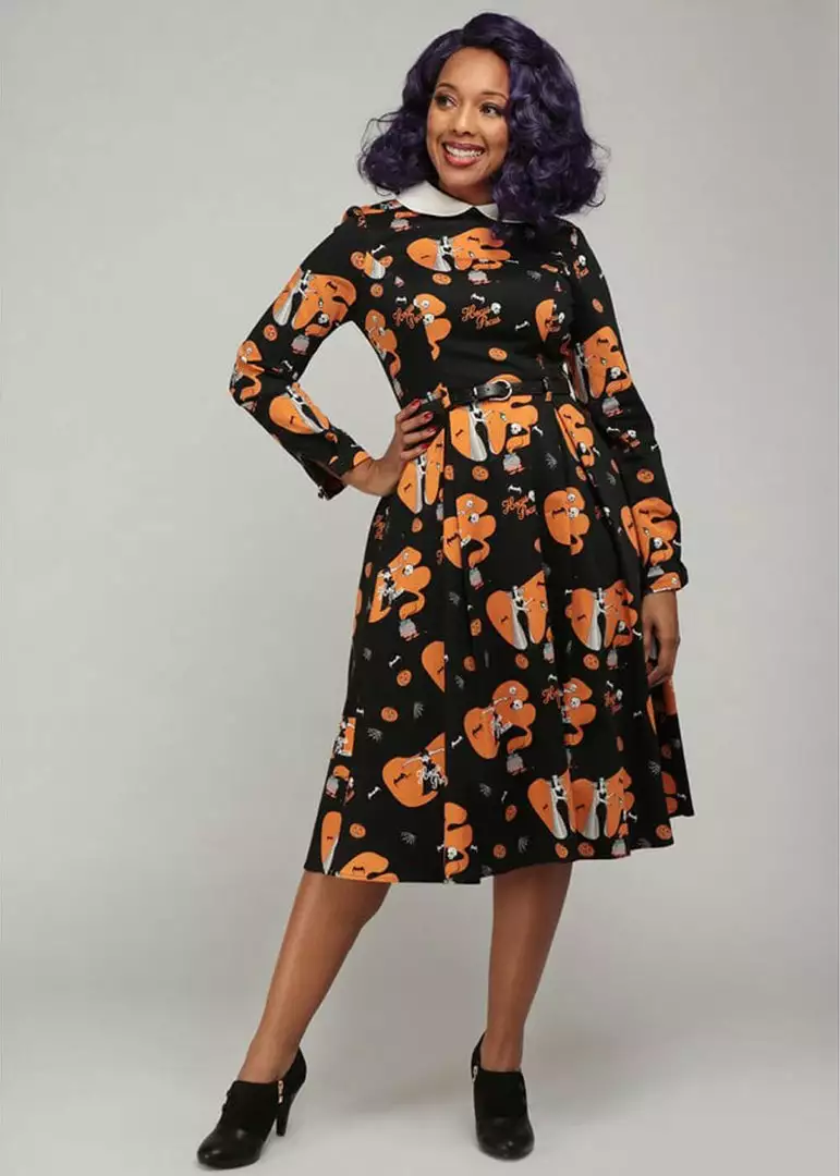 How misleadingly sweet that collar looks with that extraordinary print! The princess seams, together with that gorgeous quality cotton-mix with a slight stretch ensure a beautiful fit. The waist is accentuated with the loose belt, down from which she flares out into a full skirt. To let those ladies fly you can naturally wear her with one of our petticoats! She closes with a zipper on the back and with a height of 1,70 she reaches down to the knee.