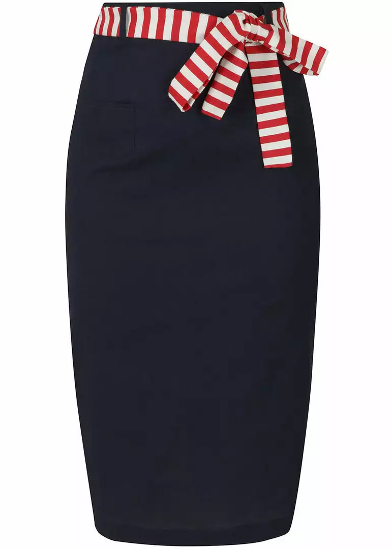 What a dark blue pin-up cutie she is with her lightweight cotton-mix with slight stretch (it looks like linen), complete with playful pockets in the front! Figure seams on both sides make for an elegant fit, from where this waist-model runs straight until around the knees or just below for a height of 1.70m. She closes with a zipper and a hook in the back, where she also has a split.