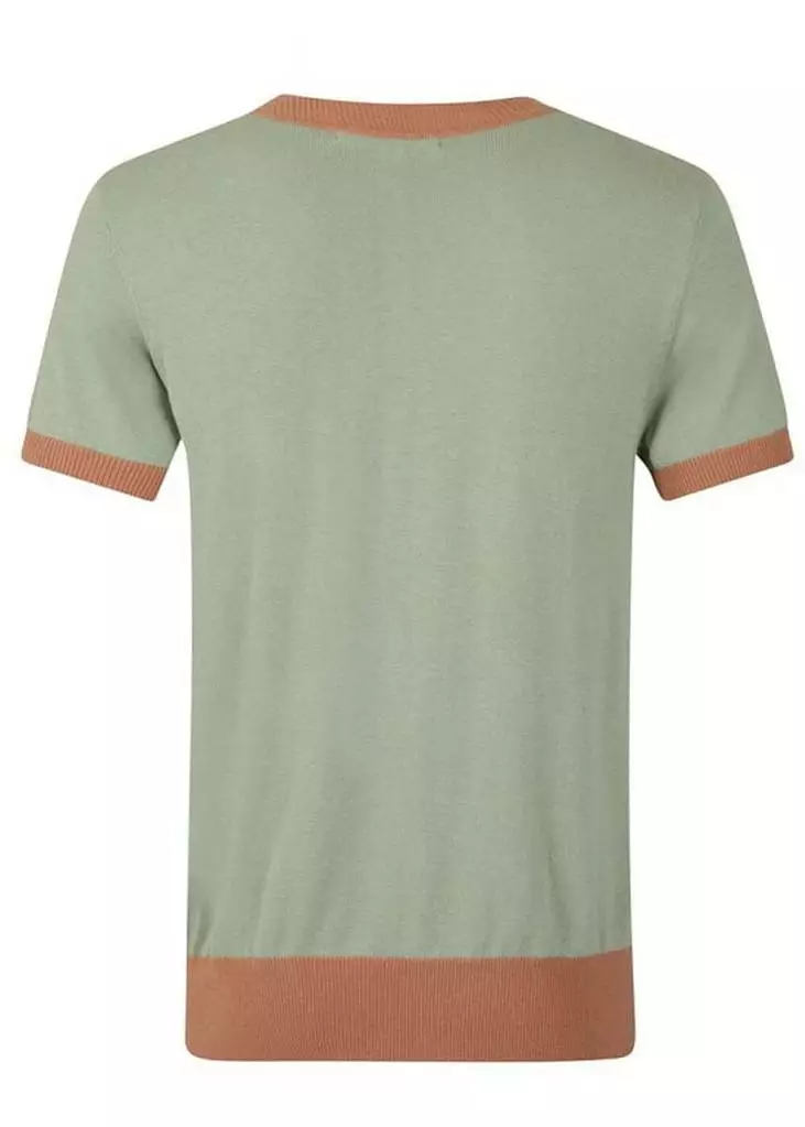 You’re seeing it right, this showstopper is made of a soft, knitted cotton giving it a slight stretch without being itchy. The edges on the sleeves, top and bottom are a retro beige and ribbed to ensure a nice fit. The backside is entirely brown.