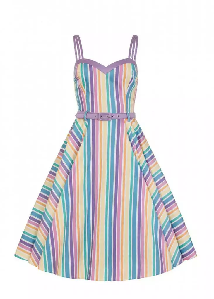 This stunning model has 3-double (!), adjustable shoulderstraps and a low sweetheart neckline so you can enjoy the sun as much as possible 😉 The seams add a beautiful fit and the high waist is accentuated by the loose belt. Downwards she flares out into a full skirt, which you can perfectly combine with one of our petticoats for that even more cheerful extra!