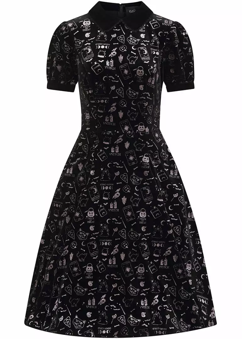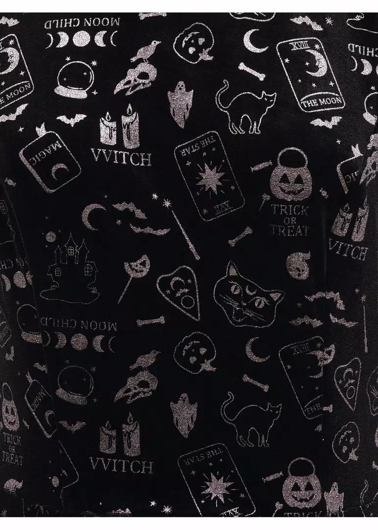 All our favourite icons have found their place in the shiny foil-print, from pumpkins to cats and Tarot cards that match the puffy sleeves and the trims perfectly.