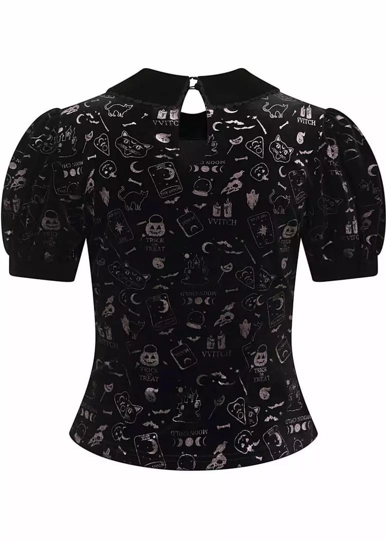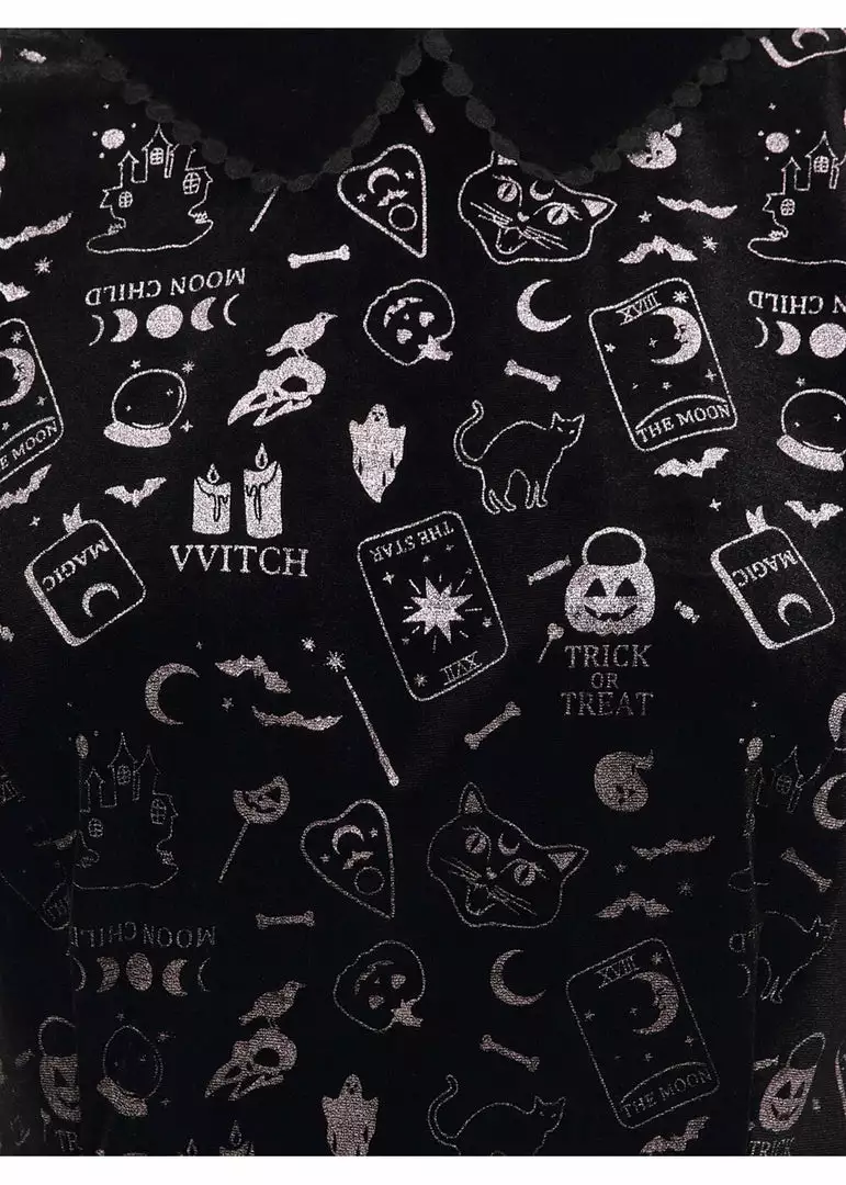 All our favourite icons have found their place in the shiny foil-print, from pumpkins to cats and Tarot cards that match the puffy sleeves and the trims perfectly.
