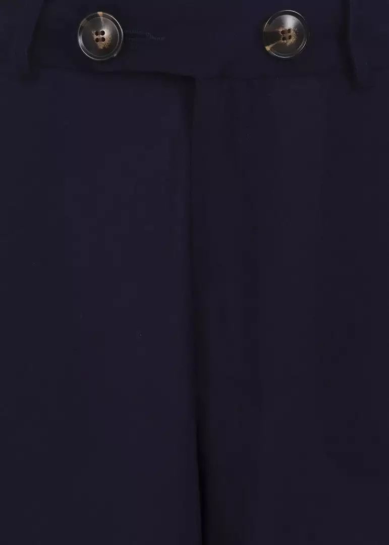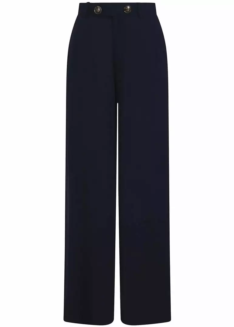 Style from the front, style from the back: Stella has it all! The waistband is adorned with two faux-tortoiseshell buttons, from where she flares into wide legs… Her navycoloured viscose without stretch is so lightweight, it’ll move along with your steps. Besides front pockets, she also has pockets in the back, the left of which is decorated with a star-embroidery! She closes with a zipper in the back and the two stunning faux-tortoiseshell buttons.