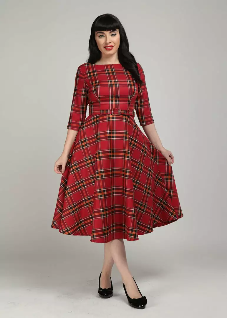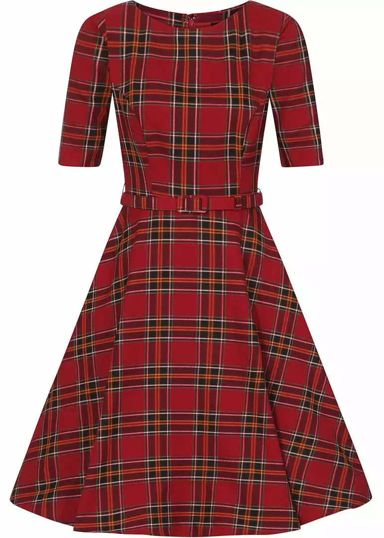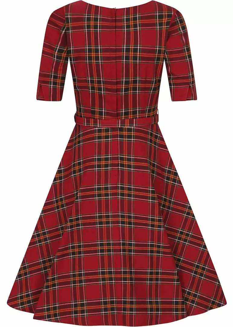 The waist is accentuated by the loose belt, downwards from which she flares out into a full skirt with pockets. She looks gorgeous when combined with one of our petticoats to really show off those stunning stripes! With a height of 1,70 she reaches just on the knee and closes with a zipper on the back.