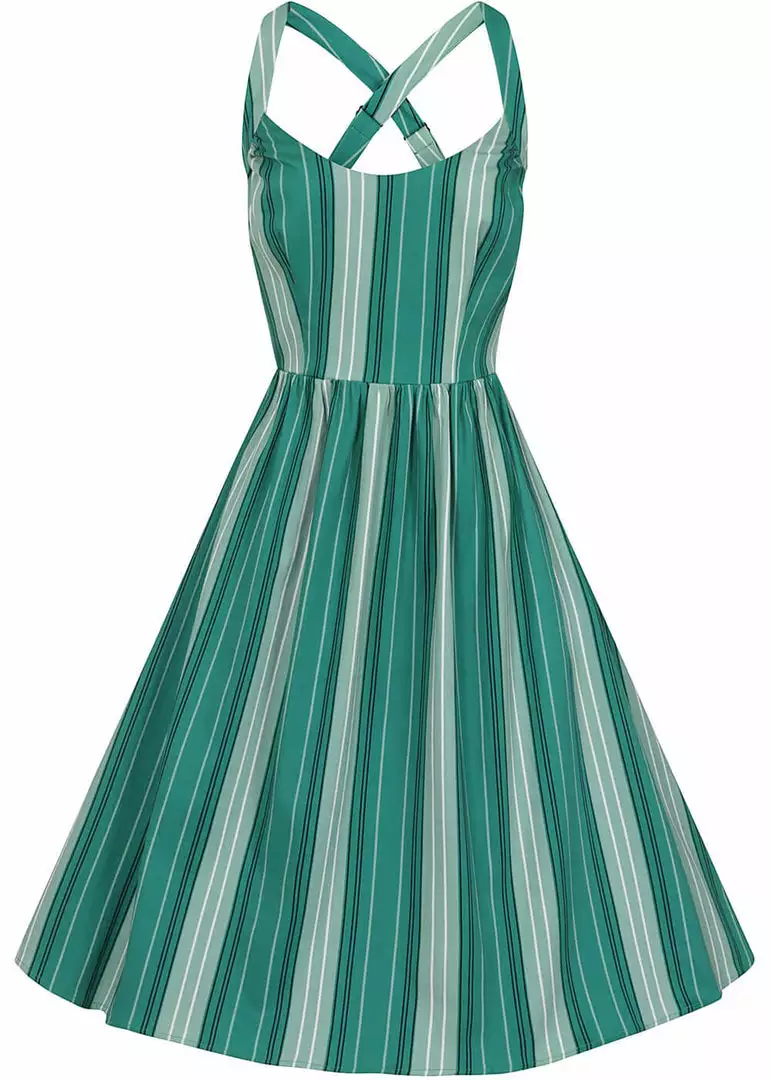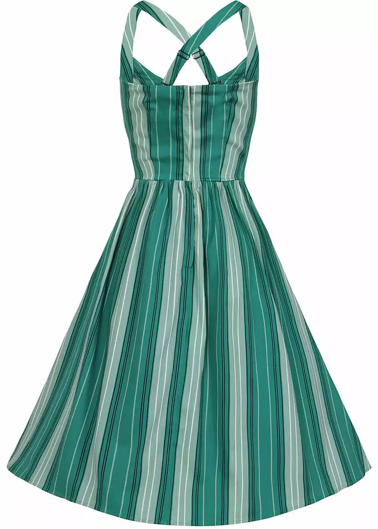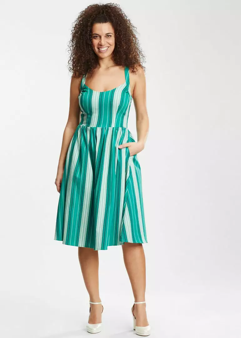From the waistband, she flares from small pleats into a full skirt with pockets, that you can perfectly wear with one of our petticoats to make those stripes shine even brighter. She closes with a zipper in the back and falls below the knees for a height of 1,70m.