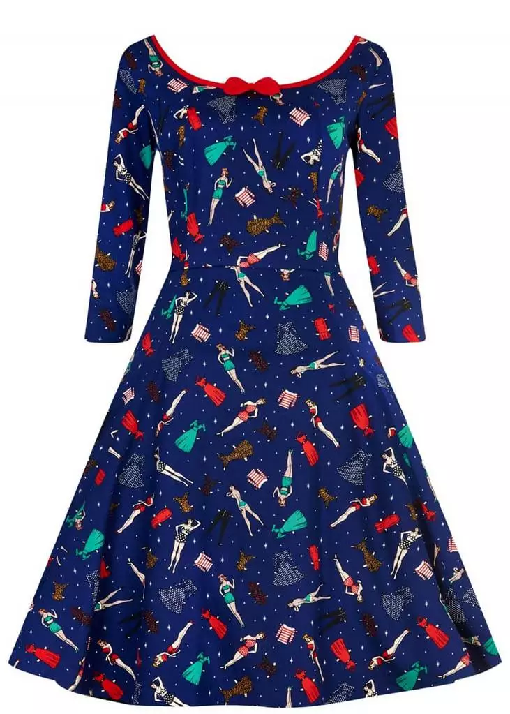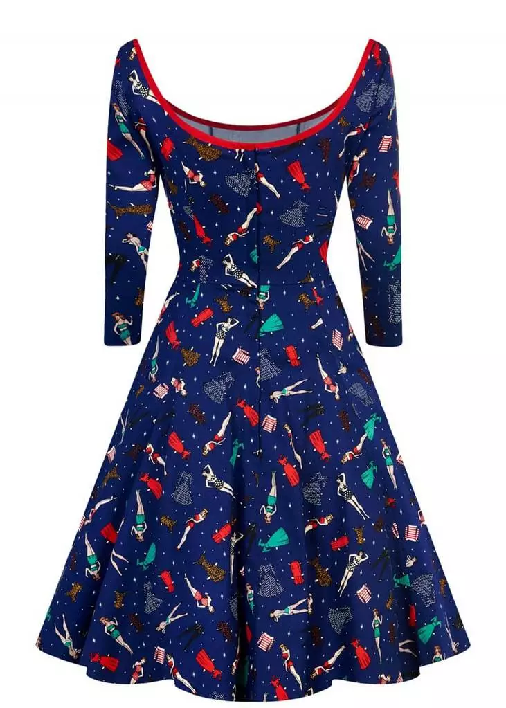 Het Willow jurkje heeft gewoon alles wat een vintage dame nodig heeft dit najaar: een heerlijk katoenen jurkje in donkerblauw met een speelse print van paperdolls met heuse Collectif kleertjes! Door de rode accenten komt de print nog beter uit de verf.