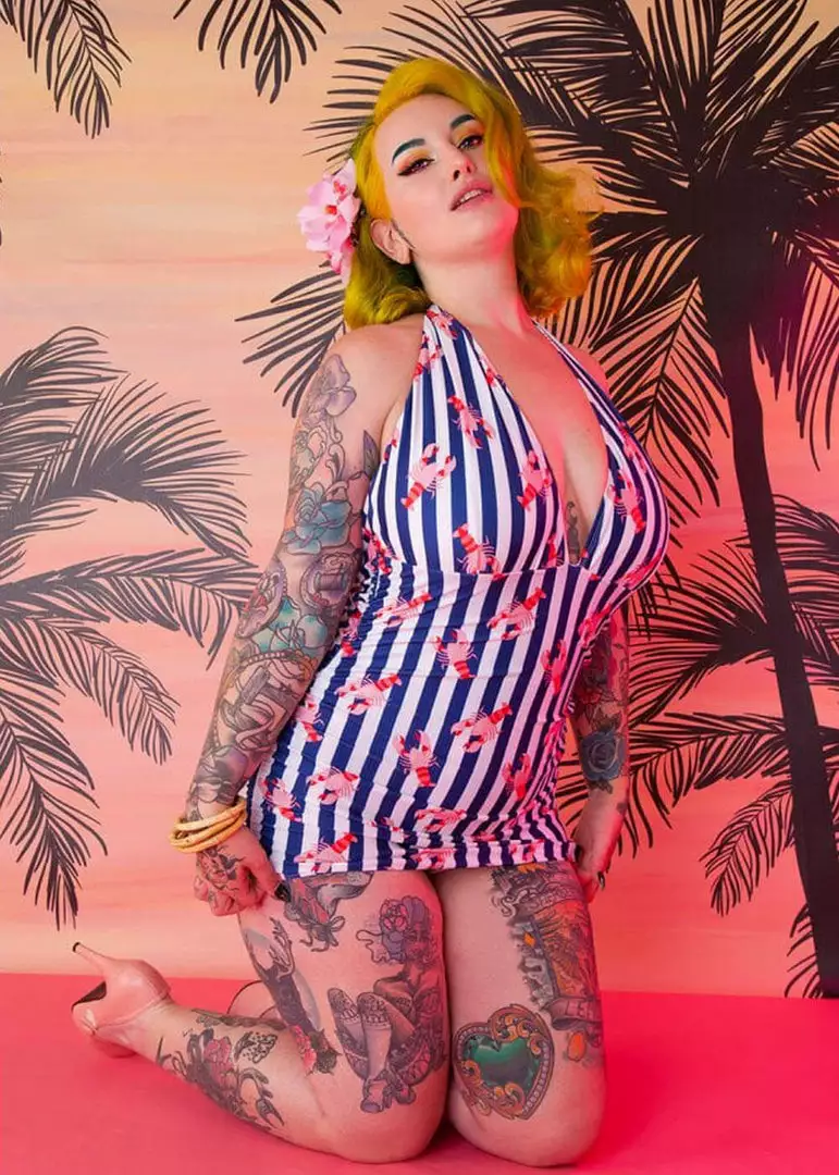 From deep within the ocean they’re coming out just to decorate your swimsuit: lobsters! These vintage inspired swimsuits are super comfortable thanks to their lovely stretch, whether you’re strolling across the beach or taking a nice swim. She has a low cleavage for that seducing pin-up look. The cups don’t have a wire or reinforcement, and continues into a halter.