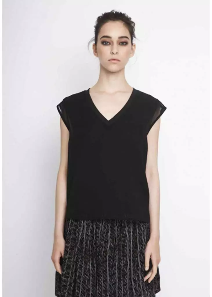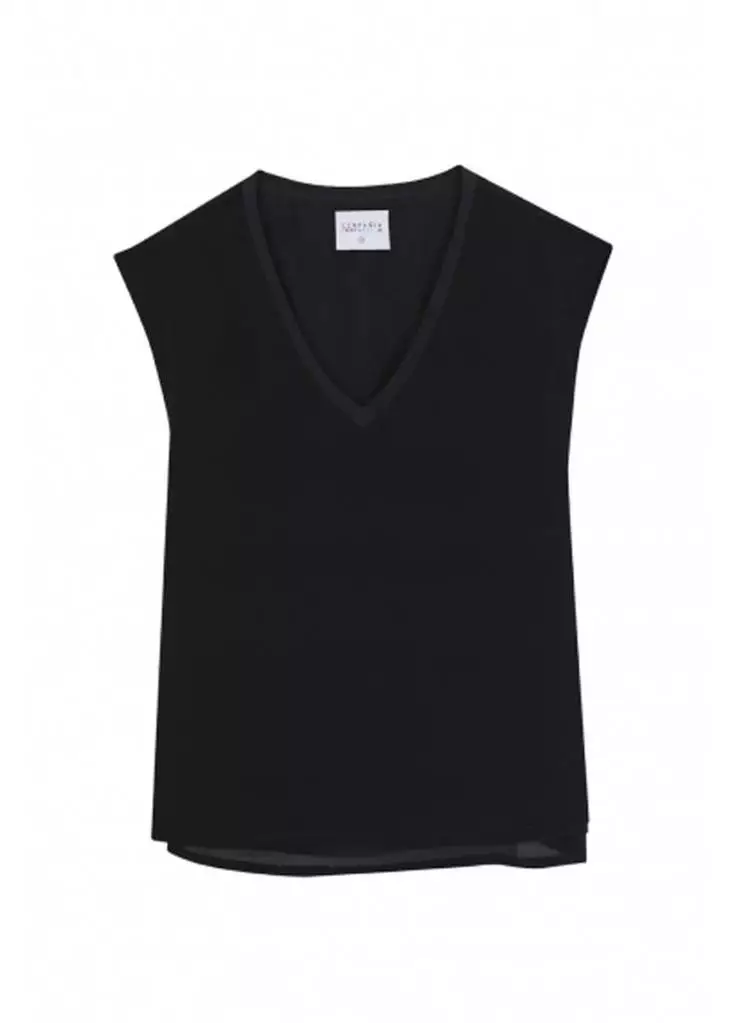 Dialgati is een fijne, rechte top, met een niet aansluitend modelletje. De zachte voering is zwart, en bedekt met een zwart chiffon. Een topcombinatie! De v-hals is afgewerkt met een jersey randje voor nog meer draaggemak. Ze is lang genoeg om boven een broek te dragen, maar ook top om te combineren met een elegante kokerrok. Opties genoeg!