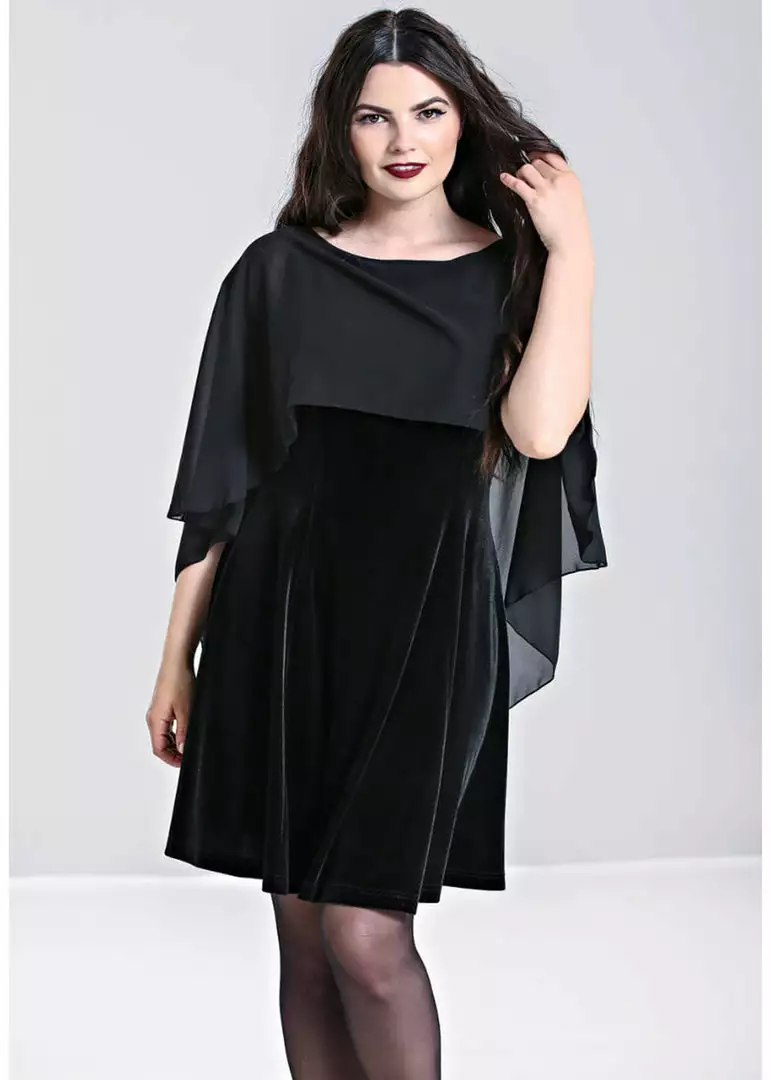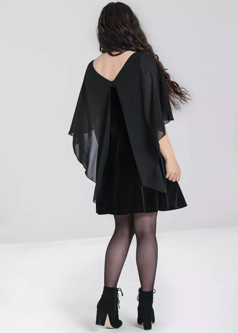 The dress itself is made of super soft velvet with stretch and is sleeveless, giving the cape all the space to shine. The dress is close-fitting at the bodice and flares slightly from the waist down. For a height of 1.70m, she ends above the knees and she closes with a zipper in the back.
