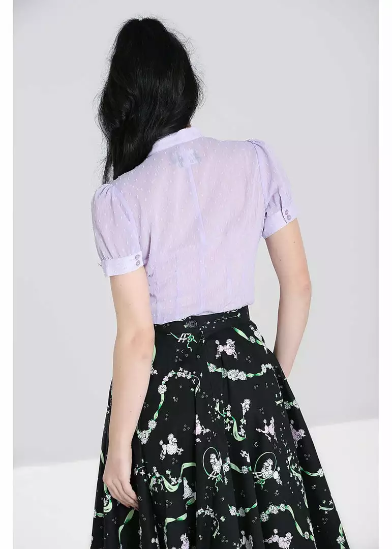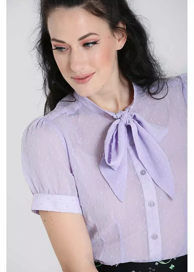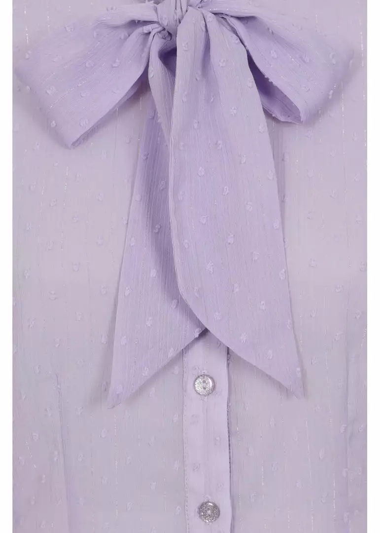 You see that right, not only is the semi-transparent chiffon without stretch adorned with dots, there are also glittering lurex-threads woven through it! She looks as festive as lightweight, and even super-fancy with her pussybow, irresistible, right?