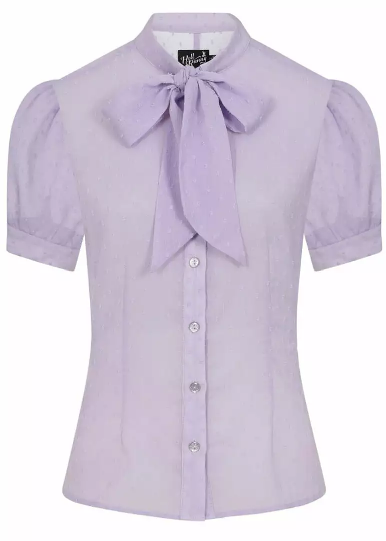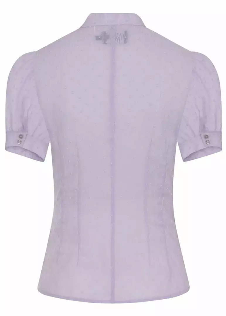 This slightly waisted model with figure seams has short sleeves, that are slightly puffy because of the gatherings at the shoulders and the structured, sleeve-ends. She closes with smooth glittering buttons and she is long enough to be worn on top of trousers, but also fantastic in combination with a high waist skirt.