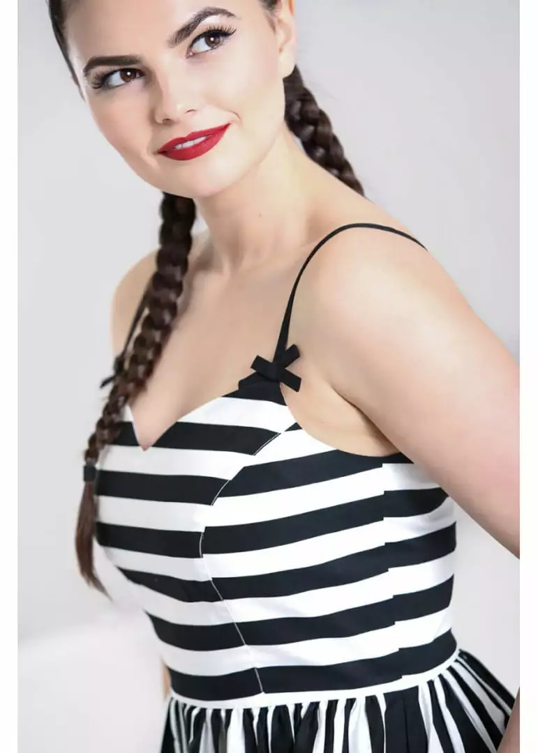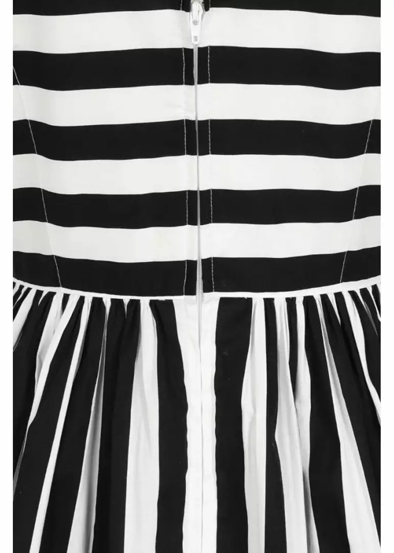 100% Beetjejuice-vibes all around with her black and white stripes! She has adjustable shoulder straps and a bodice which is gorgeously formfitting thanks to the princess seams. From the waist seam she flares into a full skirt with pockets, that you can gorgeously combine with one of our petticoats to make the stripes shine even brighter.