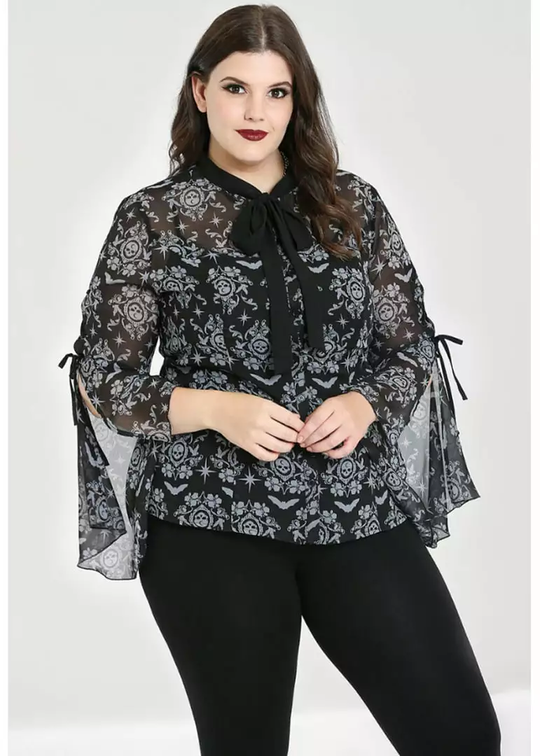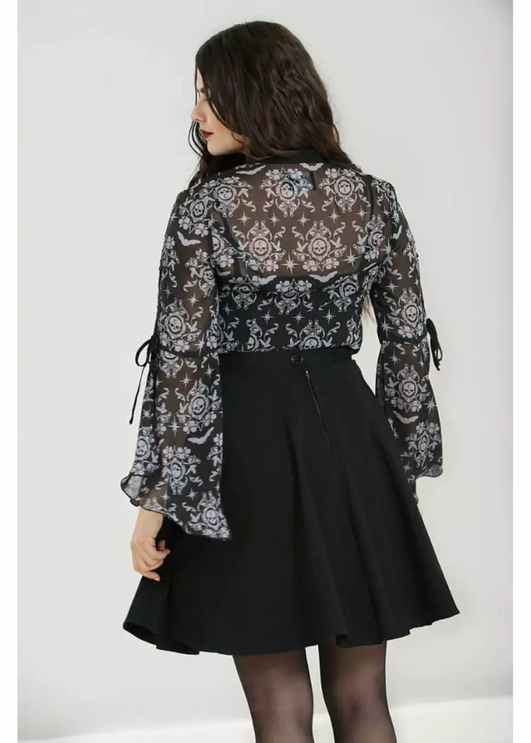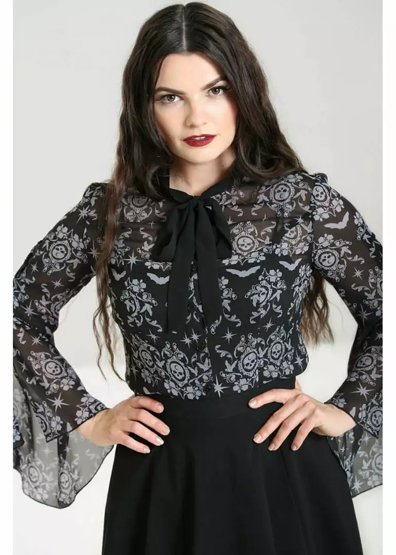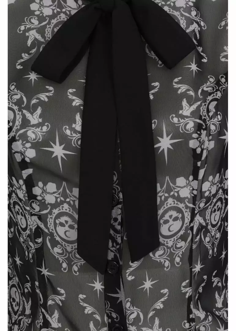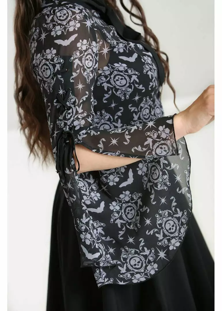 This extraordinary pretty blouse is made of an elegant semi-transparent chiffon without stretch. The special sleeves are open from the ellbows and dance along when you move your arms. The pussybow is a wink towards the 40’s. She closes with smooth buttons in the front.