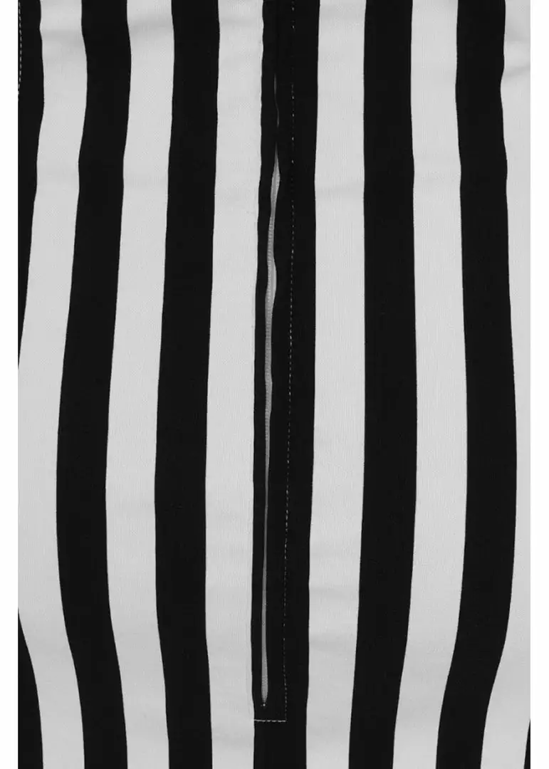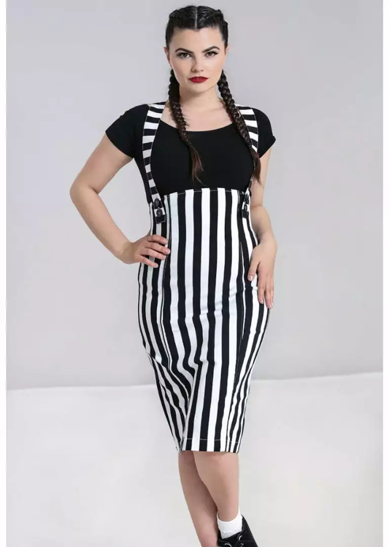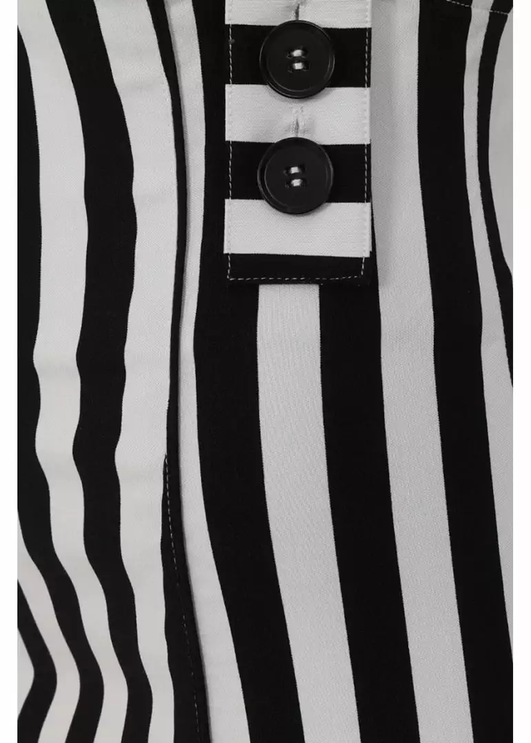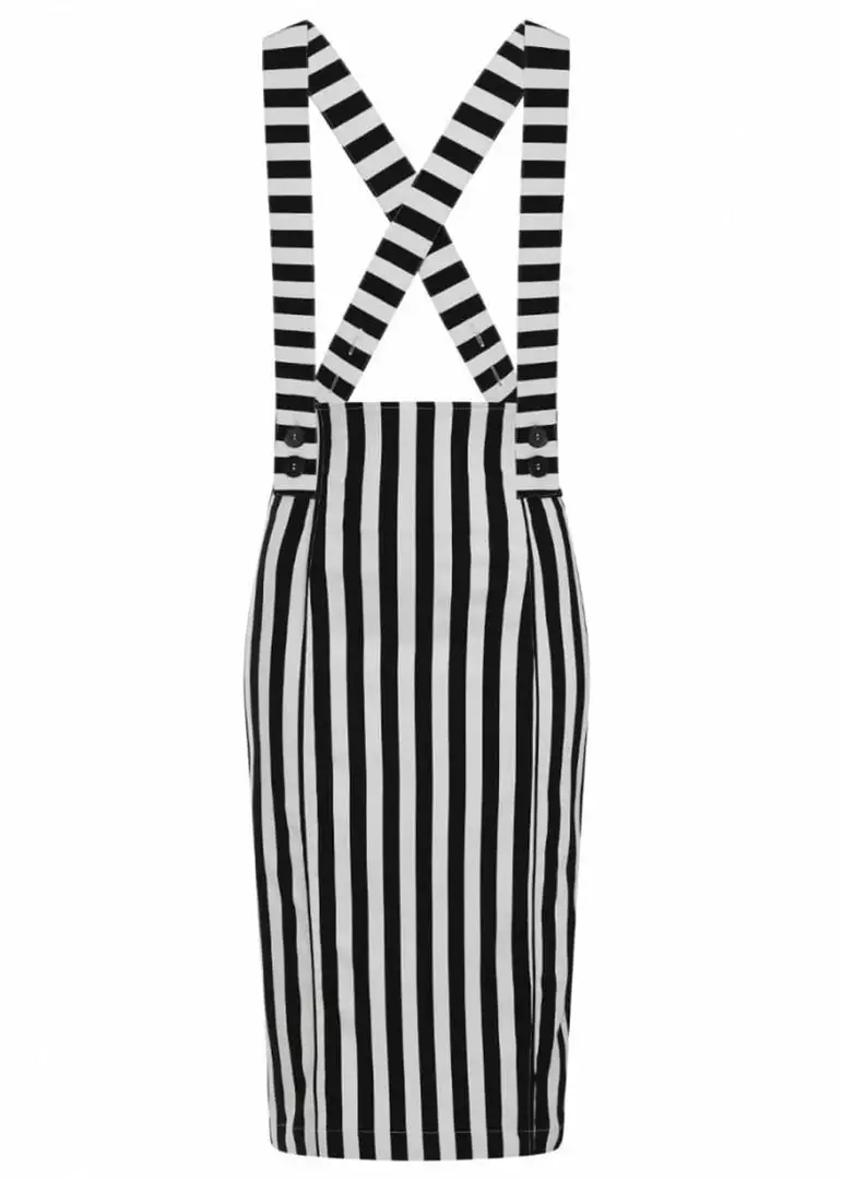 Say hi to that killer-waist, that’s how high her black and white stripes are reaching! The shoulder straps are adjustable with buttons on the outside, and because they cross each other in the back, they don’t slip off your shoulders 😉