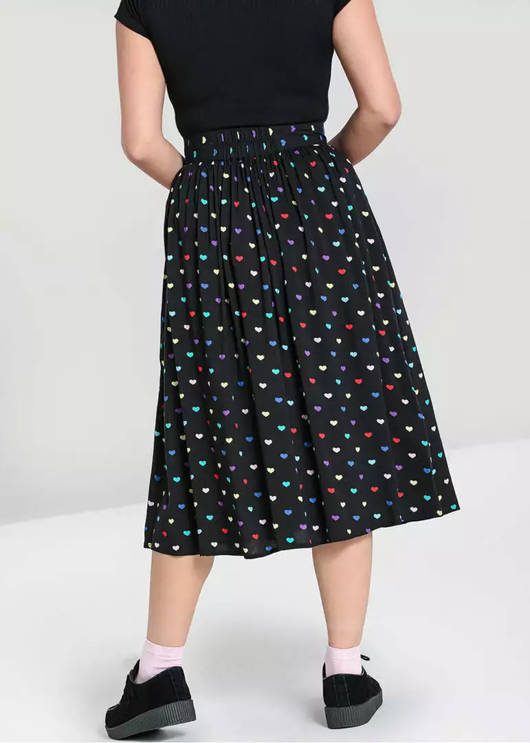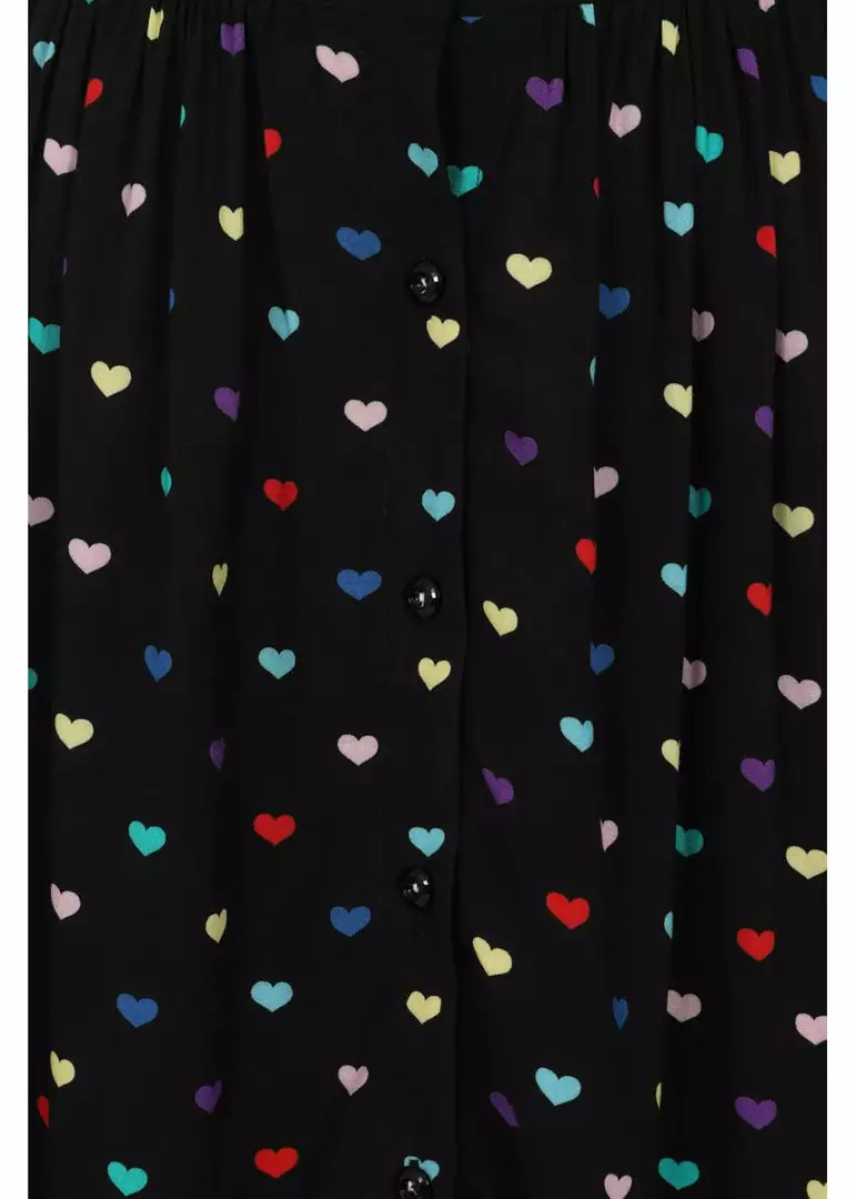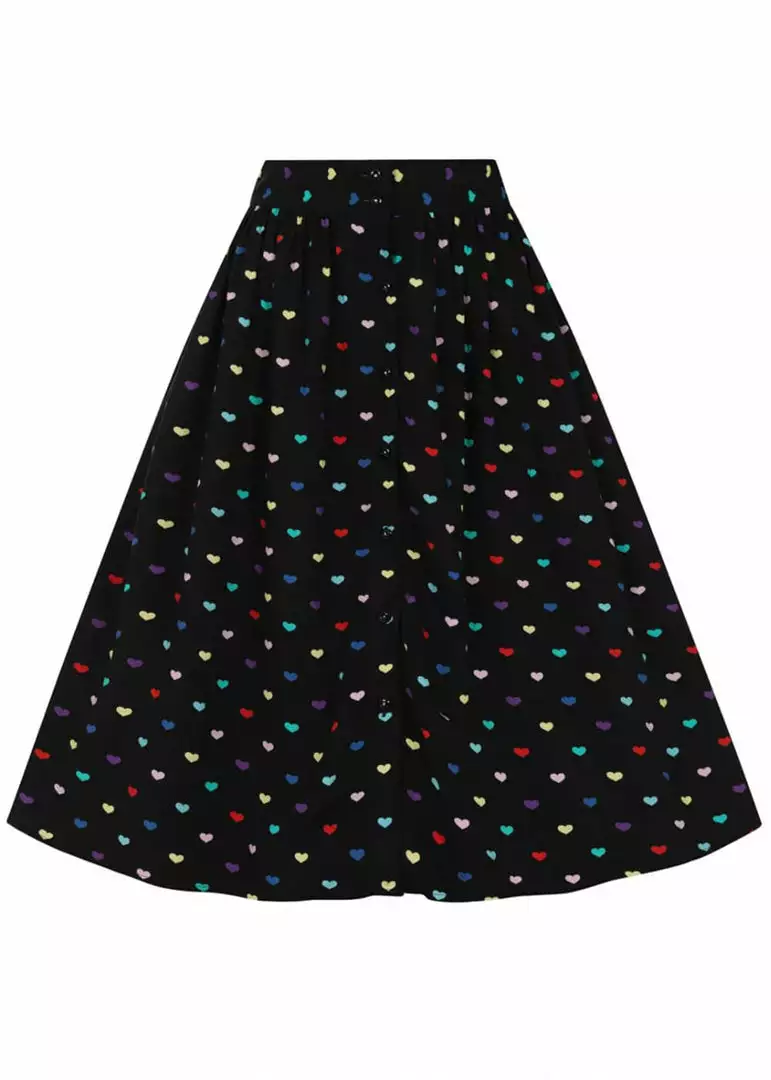 You can only fall in love with the hearts in all colours of the rainbow on the black viscose without stretch, what a beauty! From the waistband, which has no stretch, but an elasticated panel in the back for your comfort, small gatherings flare into a full skirt with pockets. She closes with smooth black buttons in the front and for a height of 1.70 m, she ends below the knees.