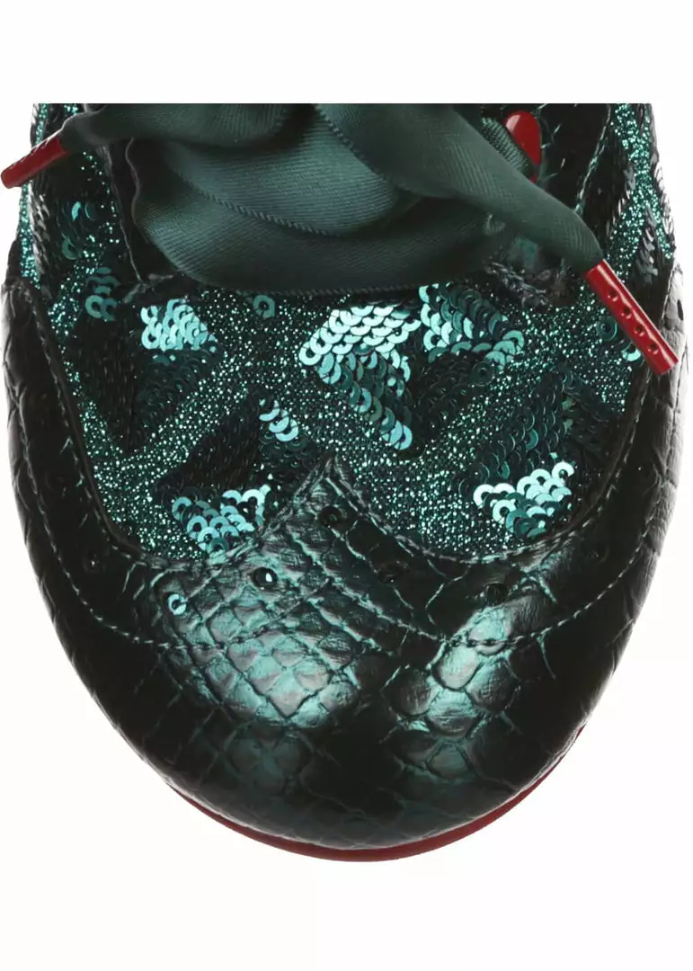 Snake print (even on the heel!), sequins and metallics that shimmer from afar? Sounds like a party, which is completed by the satin lace that runs through heart shaped rings.