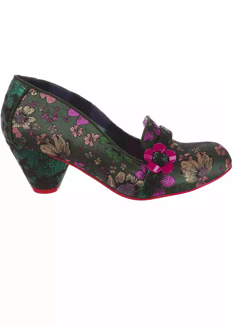 Stunning metallic flowers on green textile, you’ll be looking at your feet more than at where you’re going! The black and green pattern on the strap over the tip with the flower buckle returns at the heel.