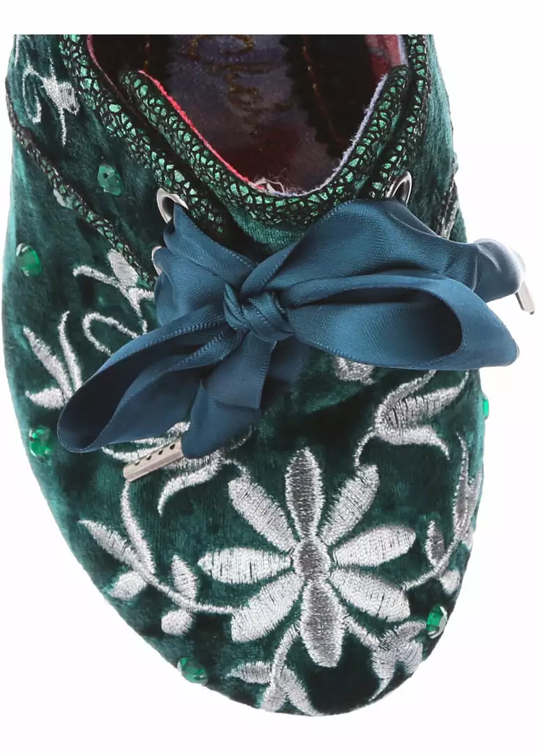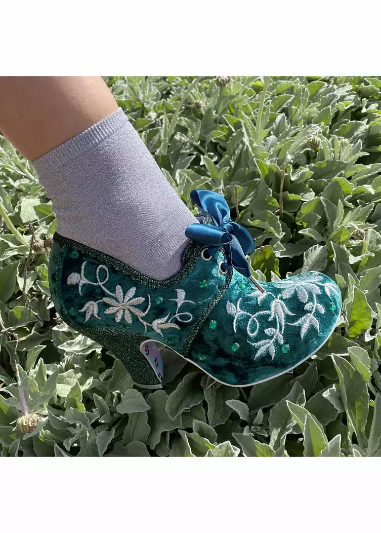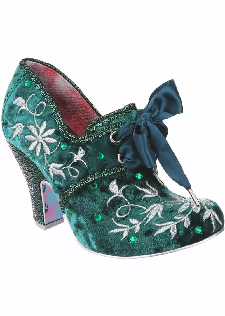 Her wider heel of 9 cm and the wavy edges are covered in glitters, and with her soft footbed she is a joy to walk on. The sole has a special print that you can preserve with the Irregular Choice Sole Protectors.