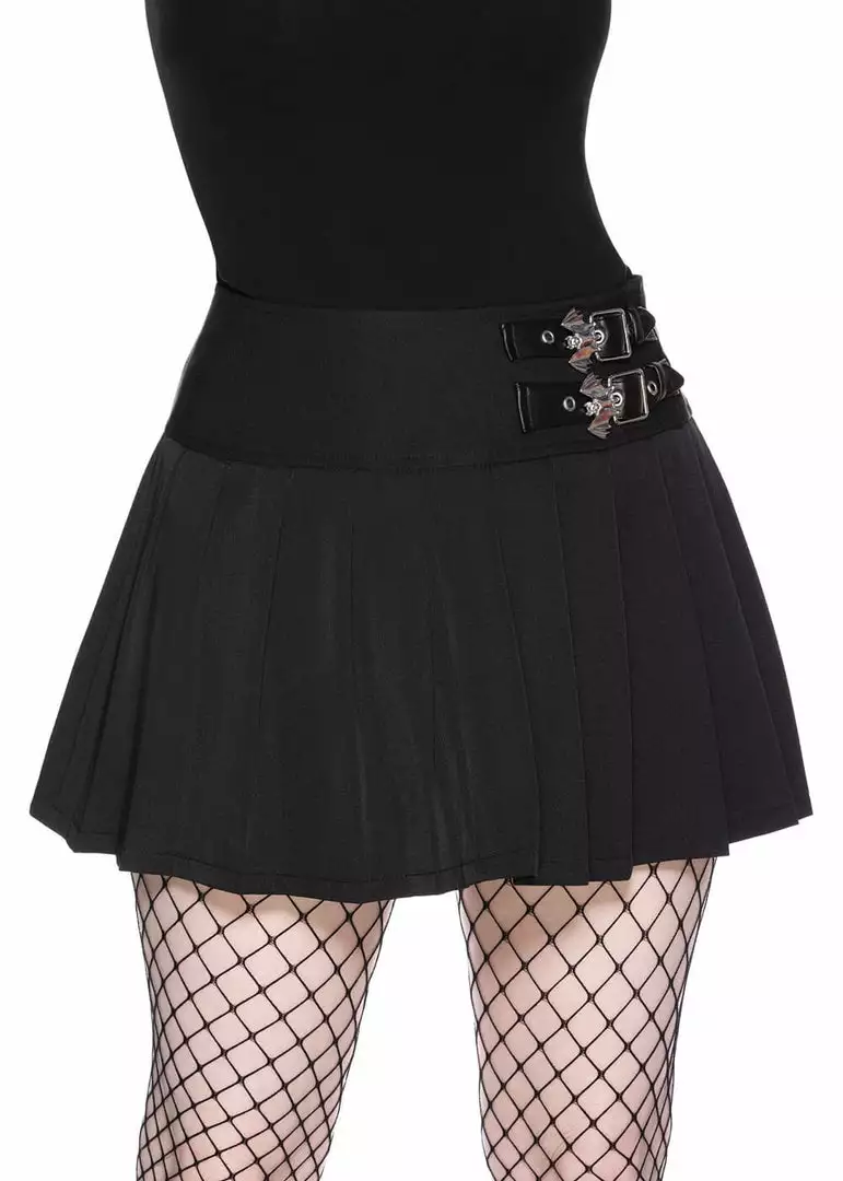 Conquer the world one stare at a time, with the happy bats adorning the buckles of this school-uniform-y mini skirt… You wear this beauty in the waist, from where flat pleats are flaring until far above the knees for a height of 1,70 m.