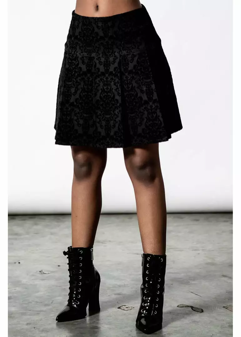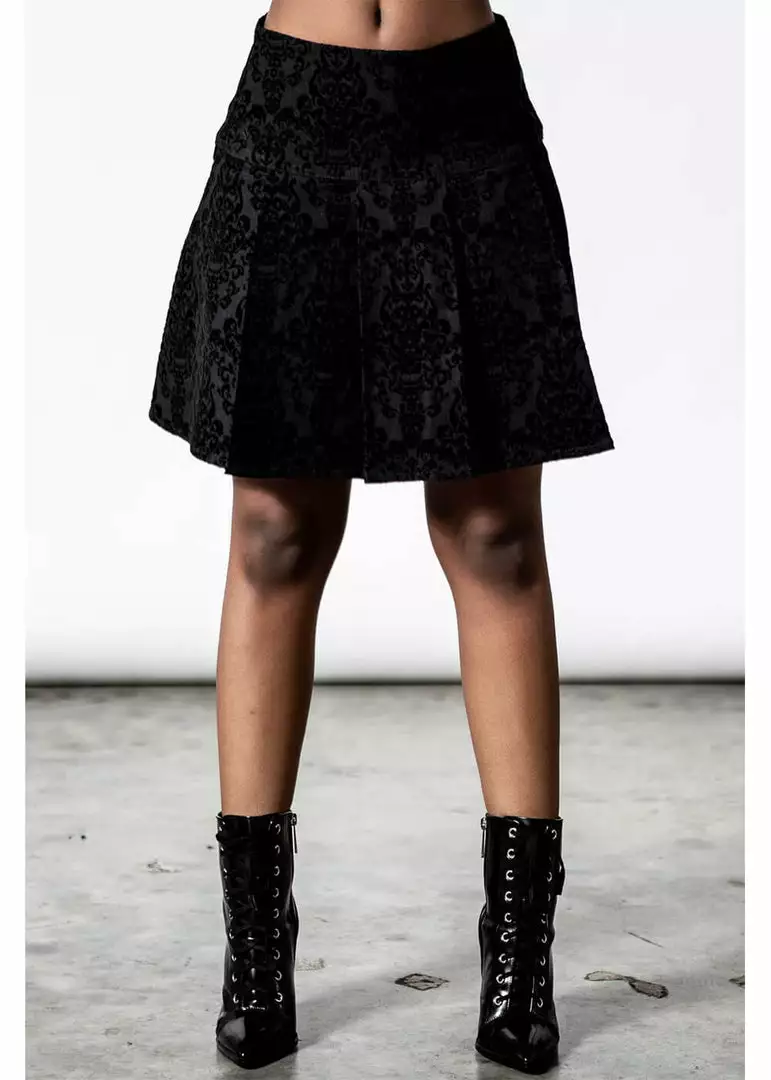 How cute she is, with her school-uniform flat pleats from halfway down and her length until far above the knees for a height of 1.70m… Or isn’t she, with the occult pattern in velvet?