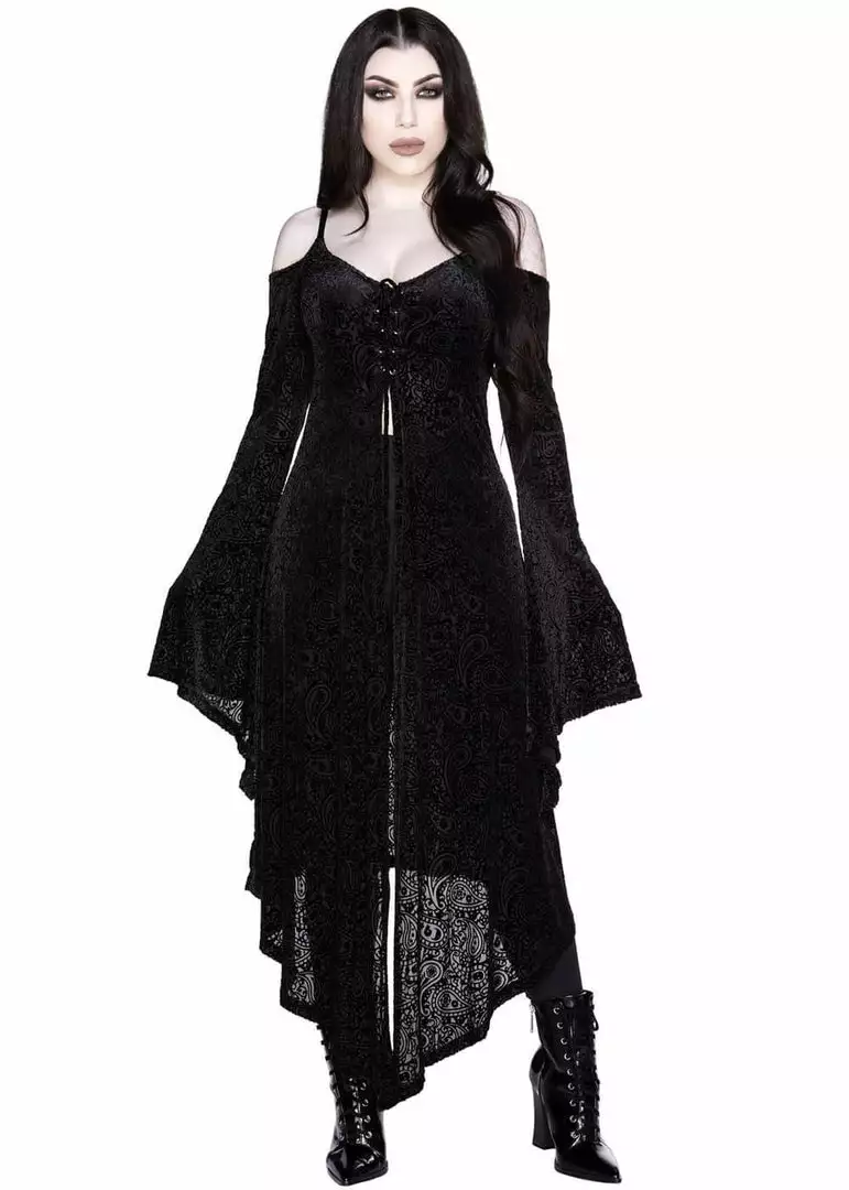The velve with fine stretch has a dreamy paisley pattern, which is semi-transparant around the pattern because of the burn-out effect. Lovely soft, perfect as decadent extra layer over your look, or boudoir-worthy with a nice set 😉 The Grateful Dread flares elegantly everywhere, from the long sleeves to the hanky hem in the back… The top is off-shoulder with small shoulder straps and she closes with a lacing at the chest.