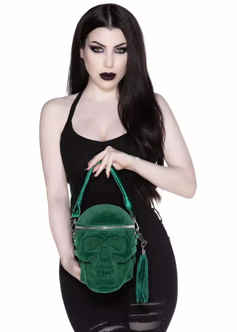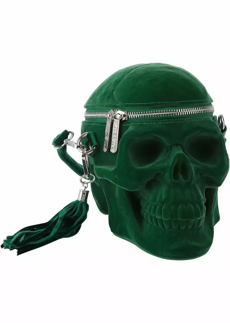 Grave Digger Skull is an extraordinarily well made back in the shape of a skull, that is covered in a layer of green velvet (handle with care). She stunningly keeps her shape and opens on the top. The tassle on the side is detachable, and she’s easily swooped over the shoulder with an adjustable shoulderstrap.