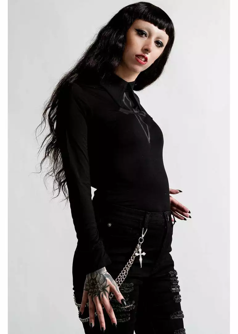 Her Faux-leather and mesh cross makes her a real eyecatcher, while the collar gives her a strong look. She’s made of a smooth but stretchy rayon-nylon-mix that feels soft, making her a joy to wear, too.