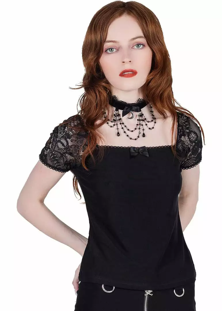 The short lace cap sleeves are seducing the eye, and did you see the little bow at the straight neckline that is also adorned with lace? The top is made of a stretchy jersey fabric, and because she ends around the hips, she’s long enough to wear her with regular trousers, but also super fancy with a high-wiast model. No zipper needed, you can simply slip in