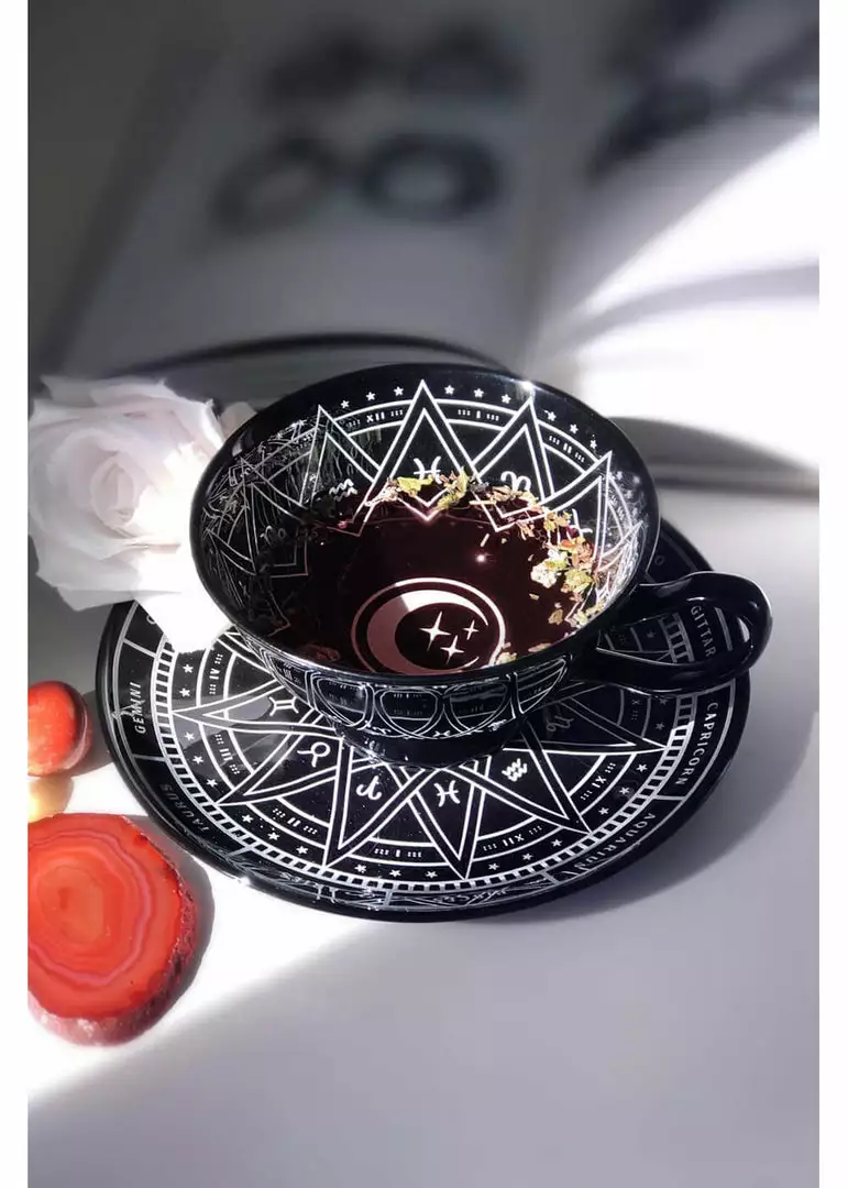Materials: Ceramic. Dimensions cup: 7 cm high x 10,5 cm diameter x 15 cm wide (with handle). Dimensions saucer: 15 cm diameter.