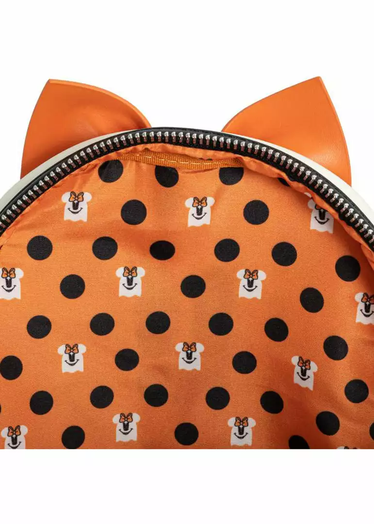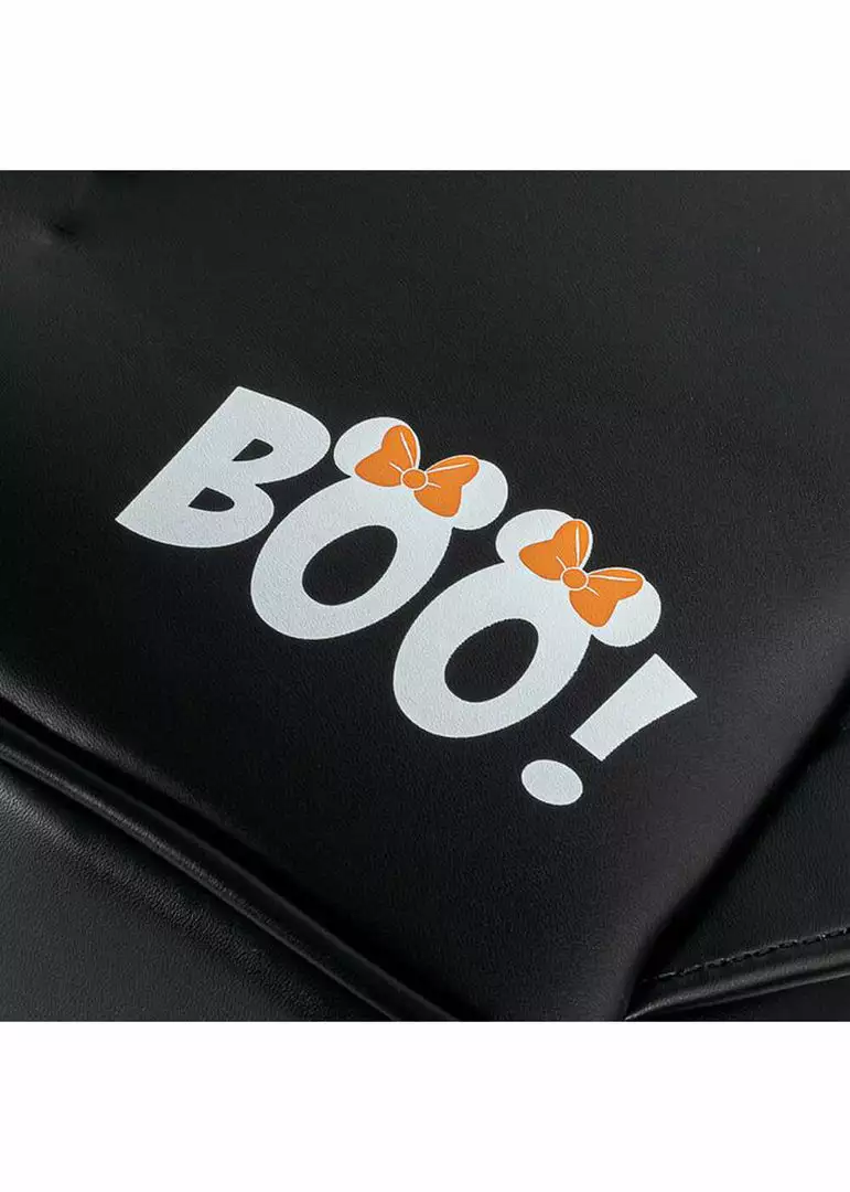 Have your things guarded by Ghost Minnie! This backpack has a zipper pocket on the inside and is spacious enough for a bottle of water, telephone, a big wallet and your essentials. The high quality faux-leather keeps its shape nicely, even the protruding details! Is has a front compartment, that, like the backpack itself, closes with a zipper. Even the lining is gorgeous with a unique print and the shoulder straps are adjustable.