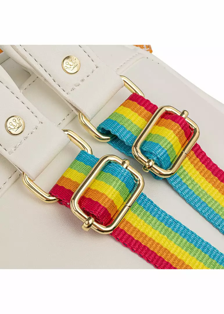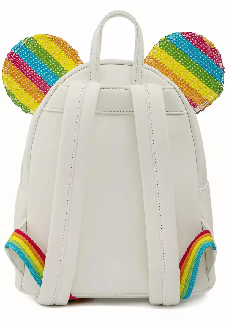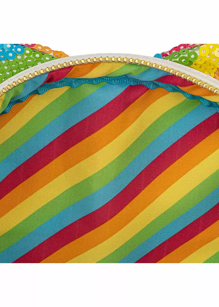 Her high quality faux-leather on the ears, the bow and the front compartment (which closes with a zipper) is adorned with rainbow sequins, that sparkle from afar.