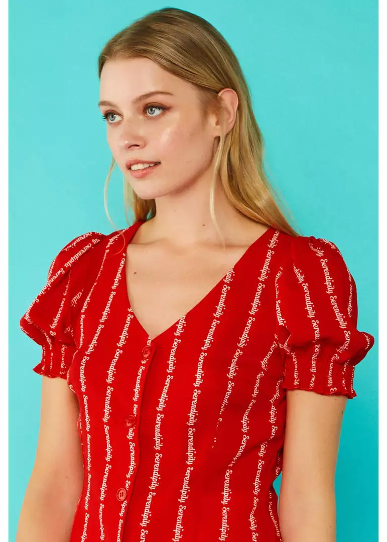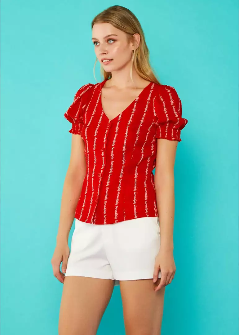 Was it a coincidence or have you been looking for this cutie? The word Serendipity repeatedly running over the smooth fabric says enough! The short sleeves are puffy thanks to the gatherings at the shoulders and the fine elastic.