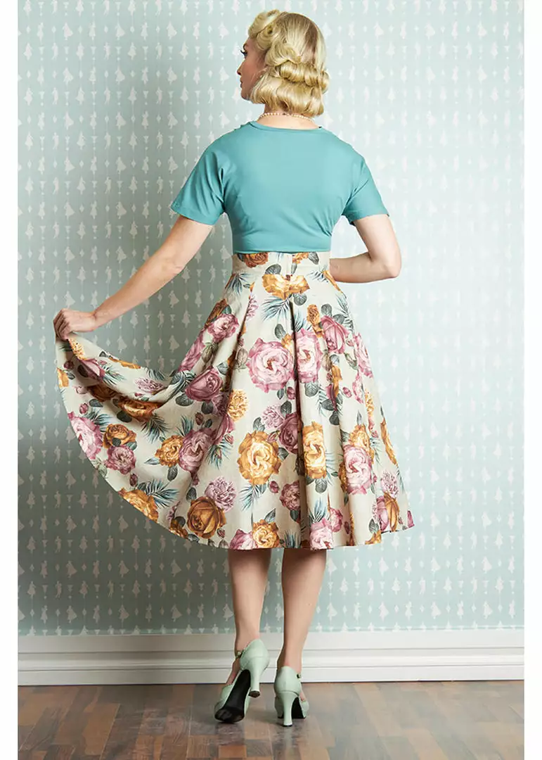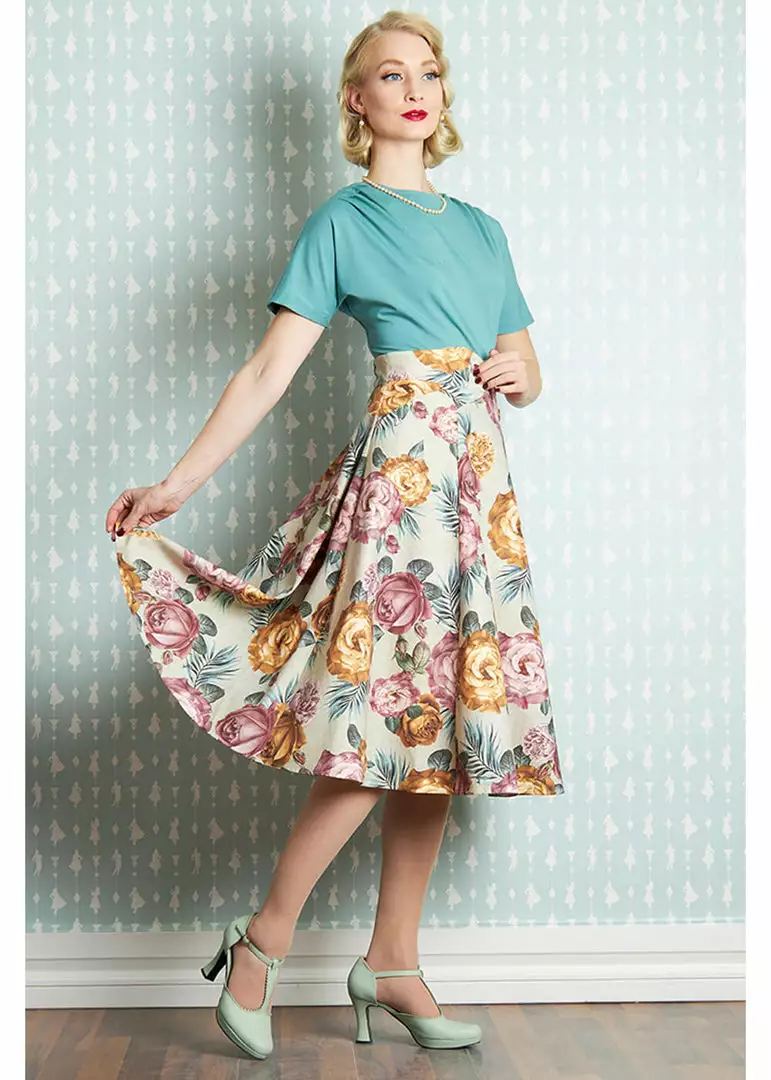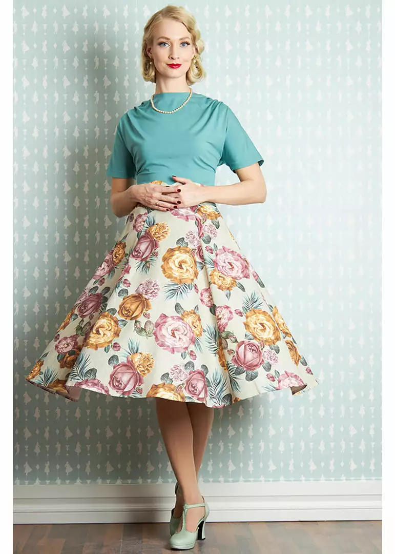 Her painting-like flowers on heavy 100% cotton it a vintage-lovers dream… You wear her in the waist, from where she flares into an elegant skirt with cute pockets. Great with one of our petticoats, but even without she’s stunning. For aheight of 1,70m, she ends below the knees and she closes witha zipper in the back.