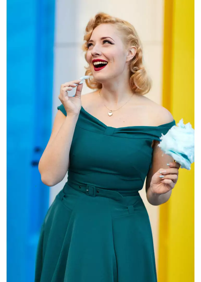 Her details are to die for… for example the off-shoulder collar, that is fastened in the middle, that also makes for a stunning back. The skirt has a surprise for you: pockets, adorned with little bows! This beauty is made of the famous high quality Miss Candyfloss fabric that has fine stretch and is lovely to wear.