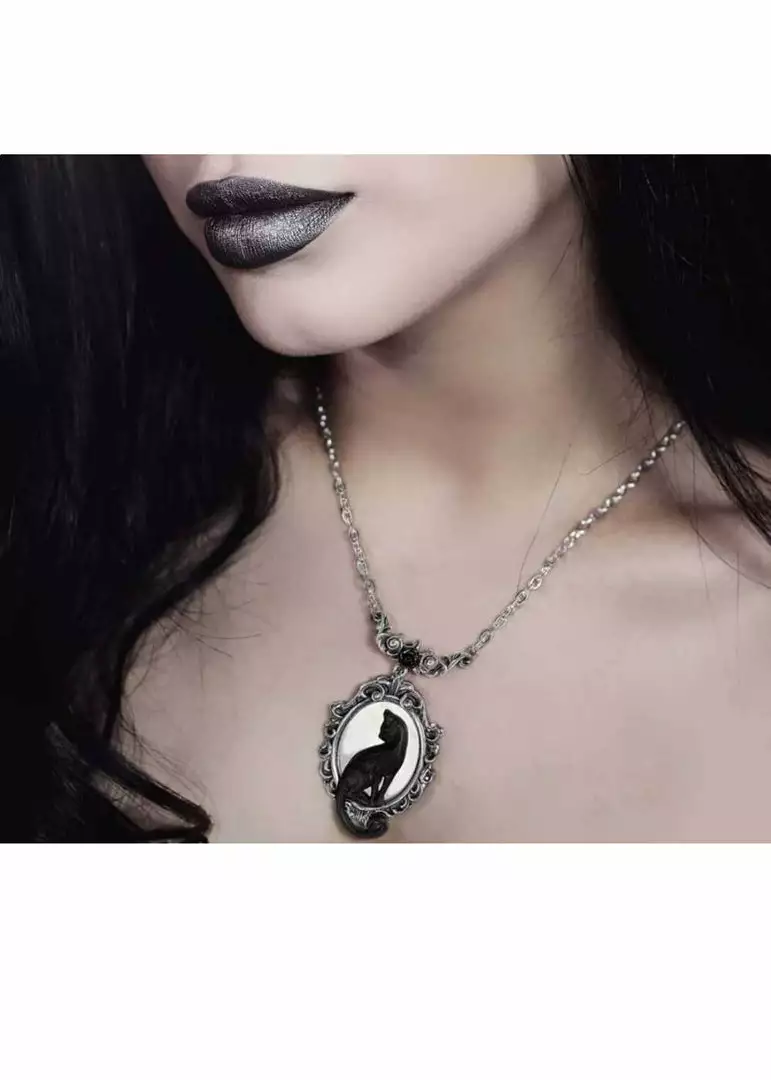 A kitty diva knows her spot: in front of the mirror! On this stunning necklace she can be seen sitting infront of a genuine mirror, with a gorgeous baroque frame.