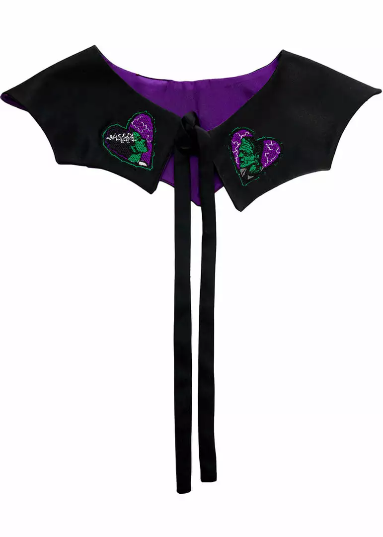 Frankenstein’s monster and his bride, both are displayed on this creepy cute collar, that closes with a ribbon in the front. The back is adorned in purple satin. Perfect for a spooky-touch for every look!